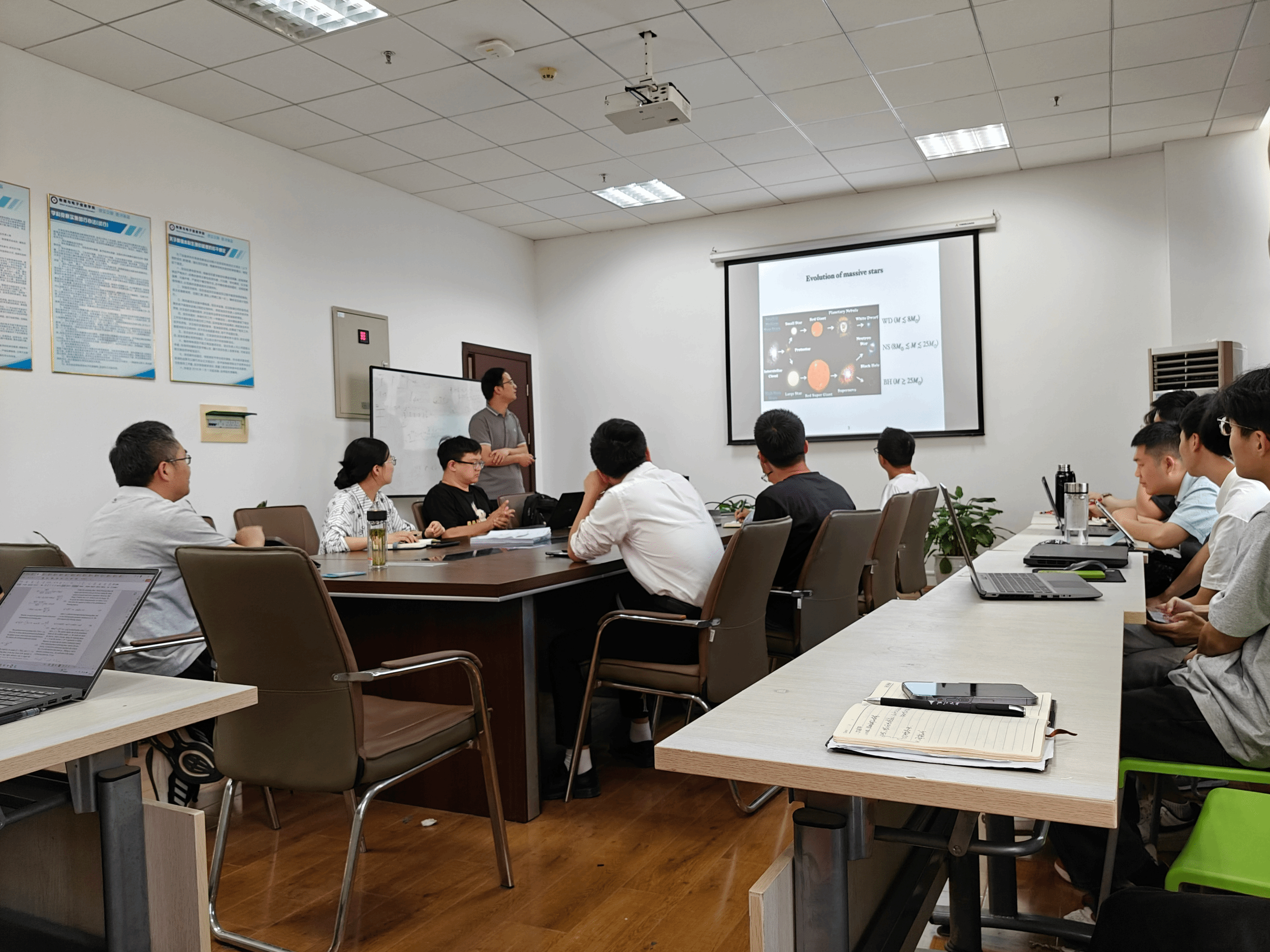 在报告会上,邵勇副教授介绍了大质量双星演化和超新星爆发、X射线/伽马射线暴发、引力波等天体物理现象相关,对理解恒星物理、星系物理和宇宙学都非常重要。然而,大质量双星的演化过程很复杂,涉及双星间的物质转移、公共包层演化、超新星的不对称爆发等。银河系和近邻星系内观测到的双星样本可以帮助我们限制这些复杂的演化过程。据此,我们开展了从Be星双星、X射线双星、极亮X射线源、双致密星到引力波源的全链条研究。到目前为止,观测的双星样本还是有限,难以很好限制双星演化过程。近期和未来的巡天项目(LAMOST、Gaia、EP、FAST、LIGO、TianQin等)会探测到越来越完备的双星样本,这将为我们研究大质量双星演化提供新的机遇报告结束后,与会师生与邵勇副教授就相关问题进行了热烈的讨论和交流。