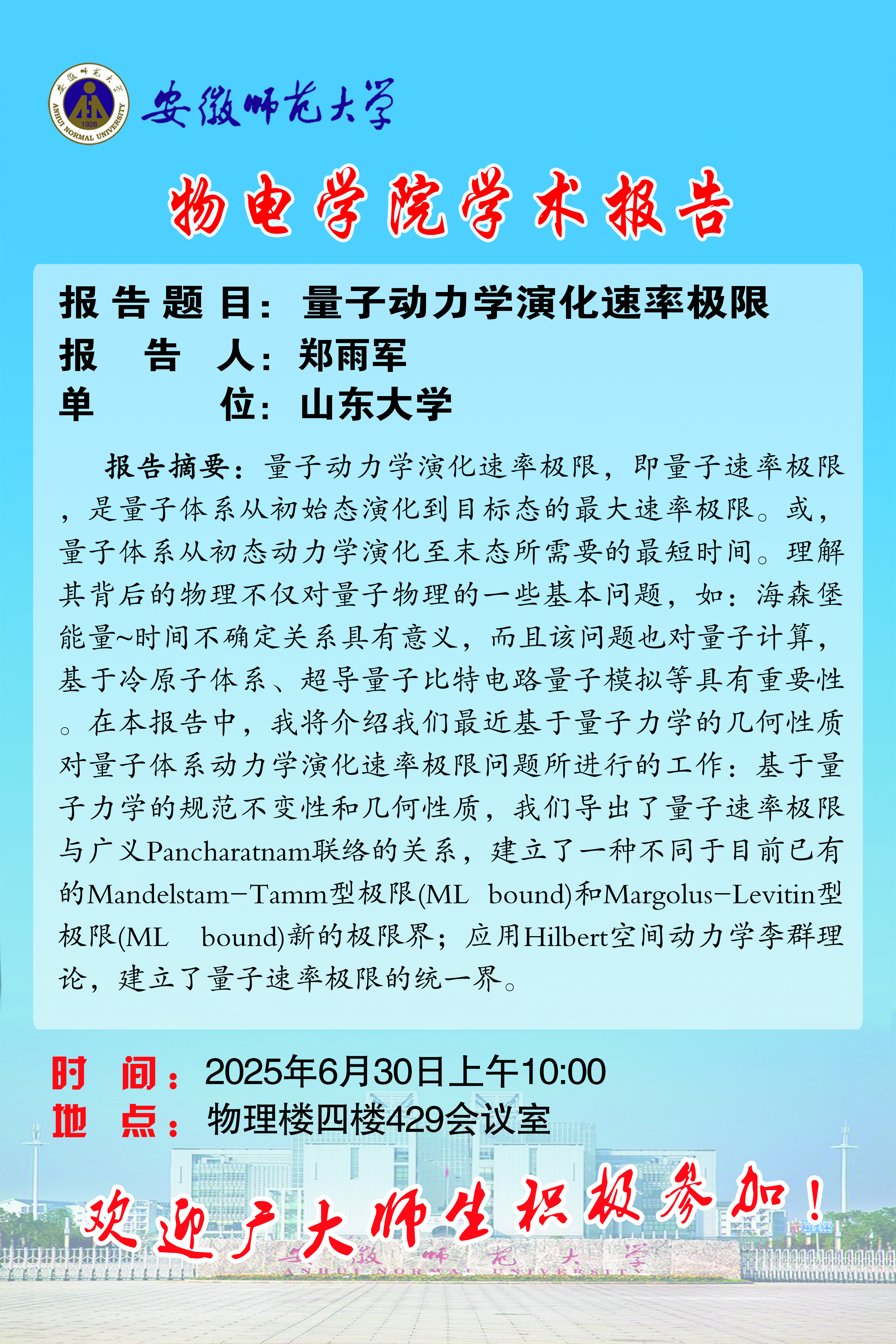 【学术预告】物电讲坛2025年第30期:量子动力学演化速率极限