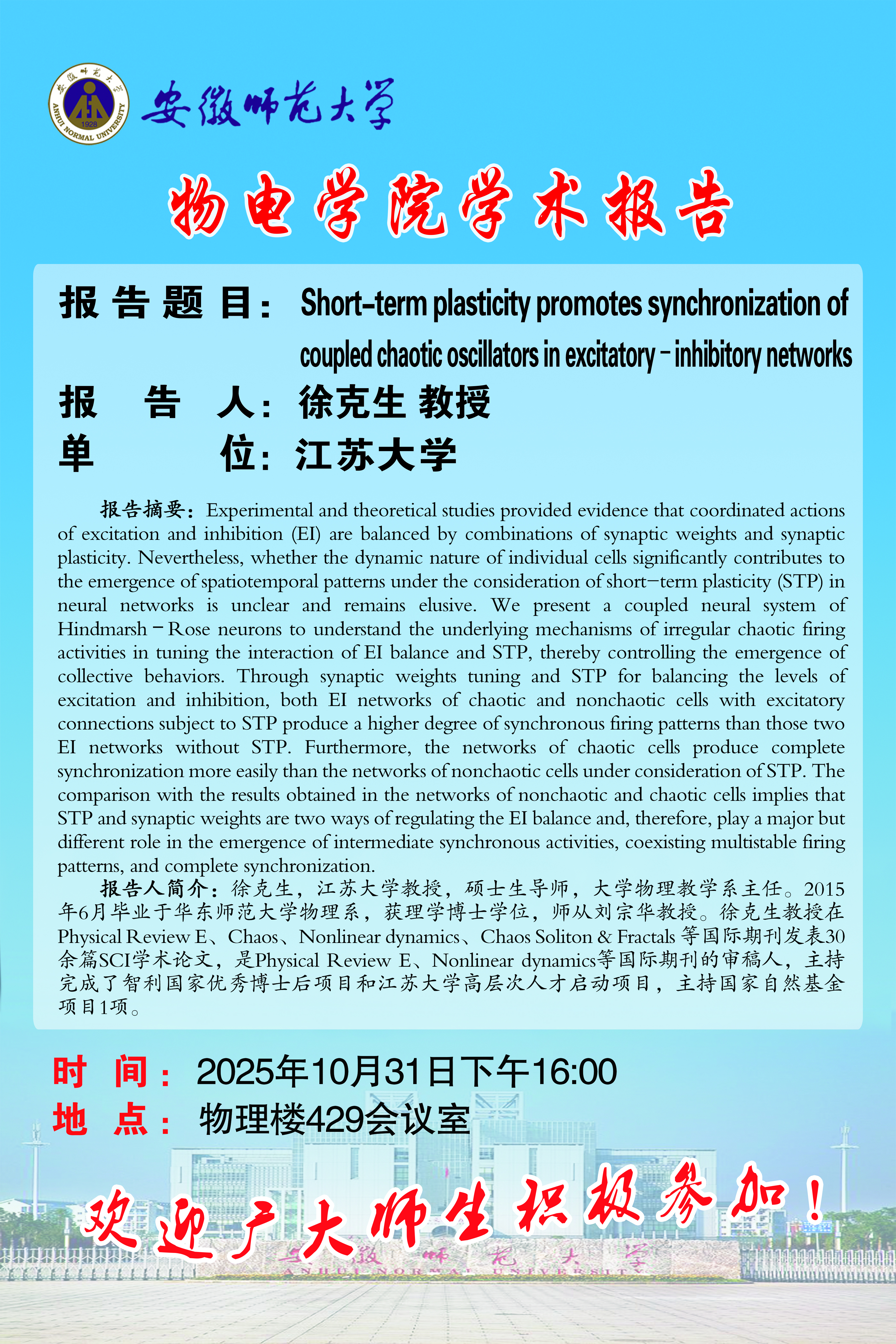 【学术预告】物电讲坛2025年第42期:Short-term plasticity promotes synchronization of coupled chaotic oscillators in excitatory–inhibitory networks