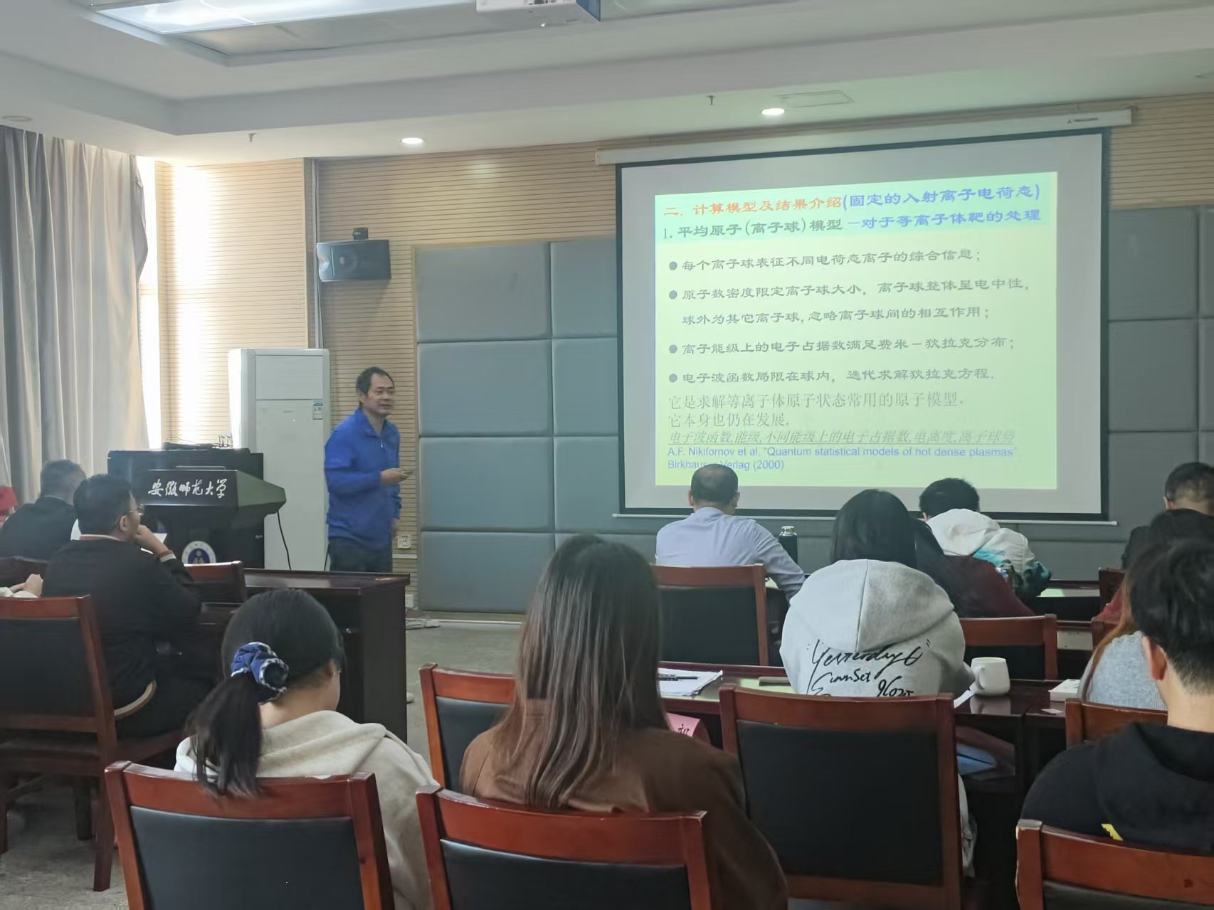 在报告中,何斌系统介绍了其在等离子体能量损失理论方面的最新进展。何斌基于平均原子模型,提出了一套等离子体中带电粒子能损的从头计算模型。该模型对非弹性碰撞过程进行了较为完整的描述与计算。何斌指出,通过与其它理论模型以及实验数据对比,新模型展现出了更高的可靠性。该研究很好地解释了α粒在氢等离子体中的能损实验,并首次揭示了入射离子激发态对其能损的重要影响,由此得到了不同于经典波尔理论看法的结果。这一发现为深入理解等离子体中复杂的能量传递机制提供了新的理论视角和重要工具。报告结束后,与会师生围绕相关议题与何斌展开了深入交流与讨论。