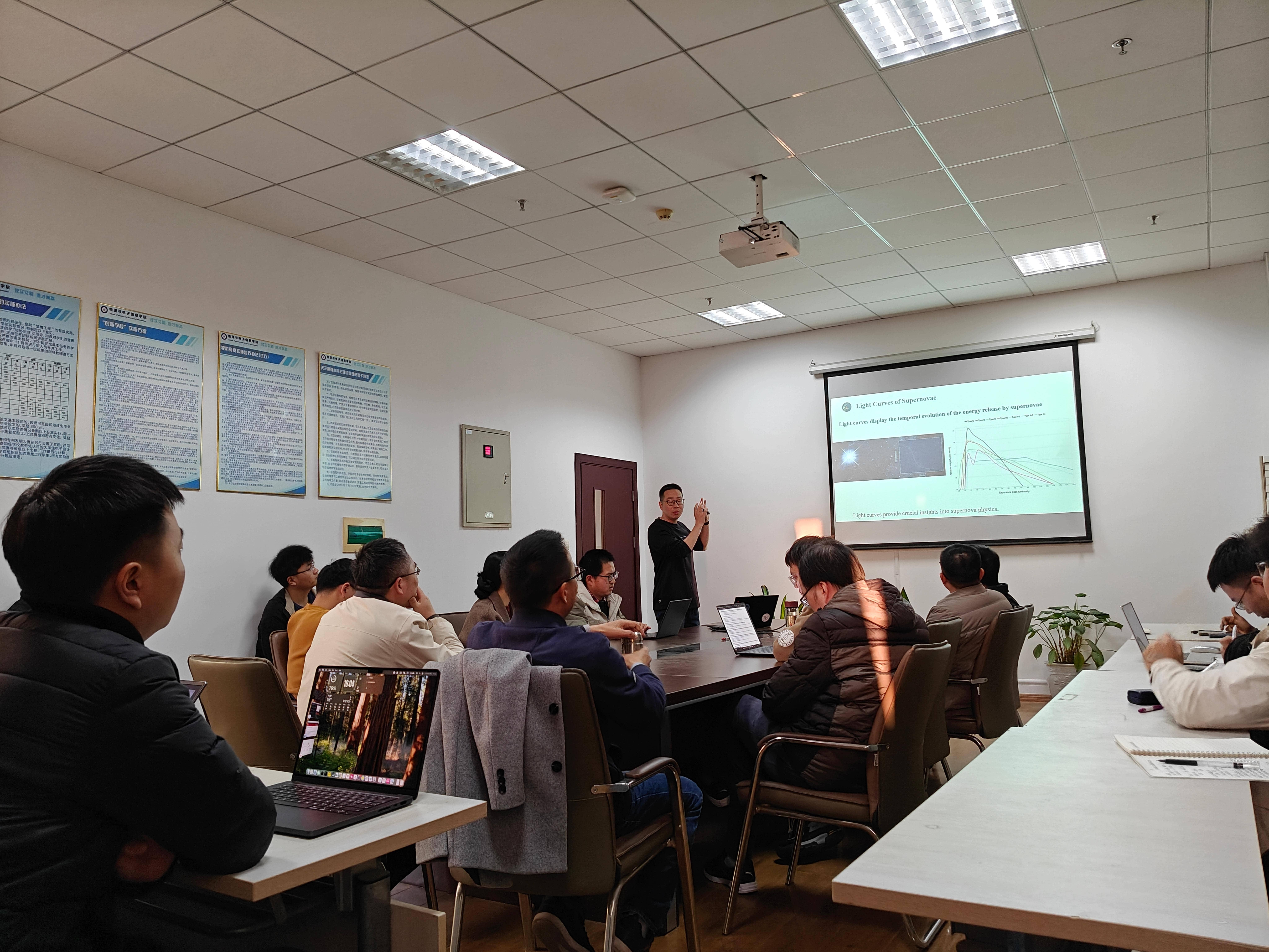 报告会上,刘良端介绍了超新星相关知识,指出目前主流超新星光变拟合的Arnett理论模型过于简化,而数值模拟虽准确但是不便于与观测直接比较且耗时成本高的问题,为了克服这一挑战,刘良端课题组从基本能量守恒方程出发,求解含时的辐射转移方程,开发出了名为TransFit的快速、高效、准确拟合超新星光变的理论工具。报告会结束后,与会师生和刘良端就相关问题展开了热烈的讨论和交流。