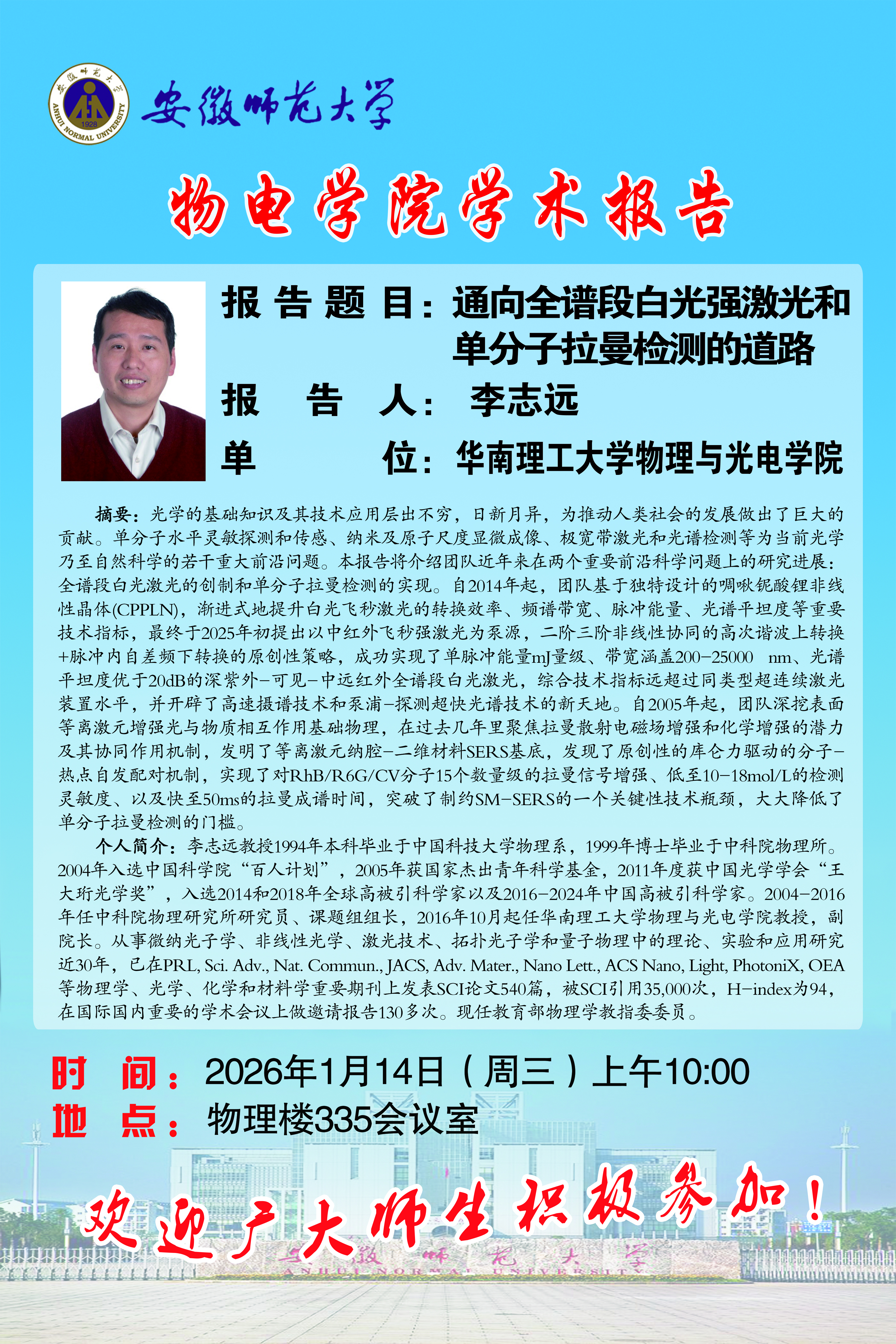 【学术预告】物电讲坛2026年第4期:通向全谱段白光强激光和单分子拉曼检测的道路