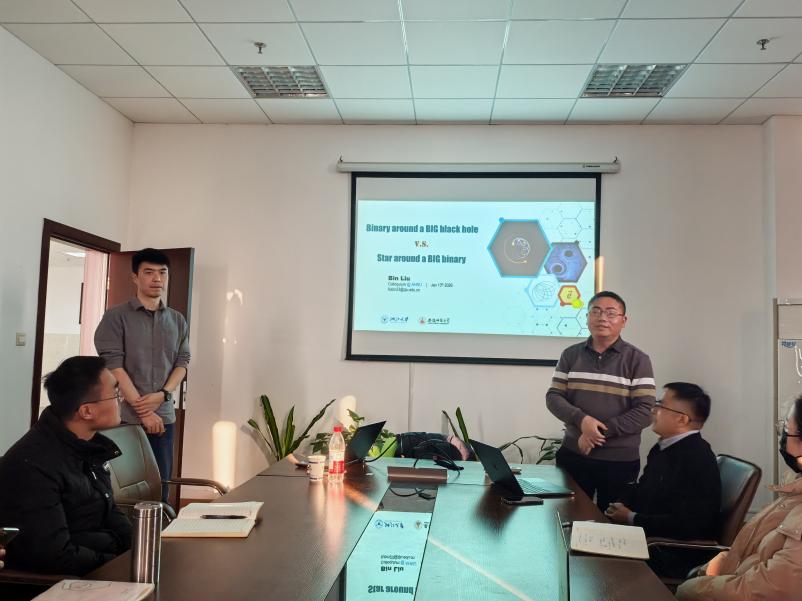 在报告会上,刘彬讲述了近年来引力波探测已经发现了超过200起双黑洞并合事件。然而,由于只依赖引力辐射产生并合双黑洞的过程十分缓慢,如何在近邻宇宙形成如此多的并合黑洞双星,一直是天文学的一个重要问题。目前的理论研究表明,三体动力学相互作用对于产生并合双黑洞可能发挥了重要作用。会上,刘彬同与会师生探讨了在第三体影响下致密双星系统的动力学过程,包括当第三体为旋转的超大质量黑洞时,长期动力学效应如何促进合并事件并提升合并效率。介绍了一种适用于共面三体系统的新动力学效应,该效应可通过邻近可见伴星的轨道演化搜寻隐藏的双黑洞系统,为将来针对低频引力波源的“多信使”探测提供理论基础。报告结束后,与会师生与刘彬就相关问题进行了热烈的讨论和交流。