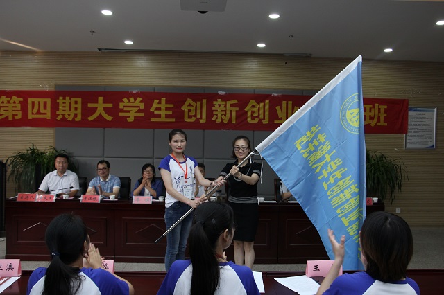 上一期双创班学员代表、2017级计算机科学与技术专业的李宗平同学,分享了他在双创班的学习心得,以及利用在双创班学习的知识参加相关大赛获得的成果,同时对创新创业培训班的培养表示感谢。本期双创班学员代表、2017级通信工程专业的李悦同学代表全体学员许下郑重承诺,服从双创班管理,顺应新时代潮流,担当新青年责任,做创新创业有为青年。随后,梁燕书记为暑期大学生创新创业实践团队授旗。