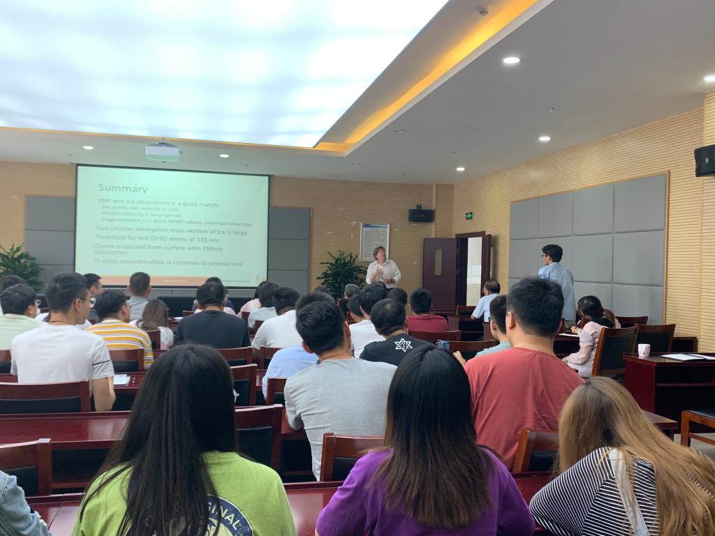 在本次报告中, Parker教授首先为大家介绍了离子速度成像技术(VMI)的发展历程及其在分子动力学领域中的应用;随后重点讲述了他们课题组将离子速度成像技术技术应用于光电离光解离动力学、非弹性散射方面的研究,以及最近开展的分子冰面上的光致脱附实验。讲座结束后,与会的各位老师和同学就自己关心的问题与Parker教授展开深入交流与讨论。