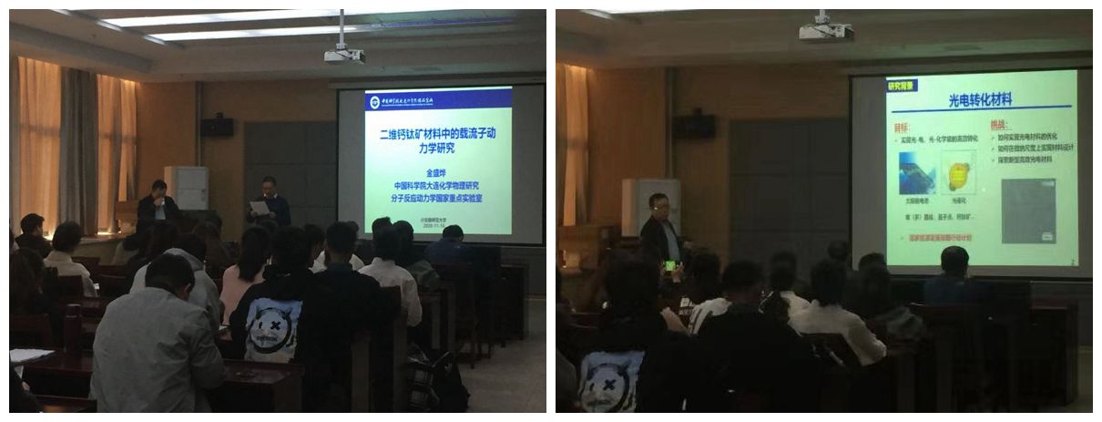 在本次报告会上,金盛烨研究员首先对光电转化材料和光电转化动力学的研究背景以及钙钛矿中的载流子动力学原理及特点进行了介绍。随后,他详细阐述了超快时间分辨光谱技术以及“可视化”的时间分辨成像法在研究二维层状钙钛矿薄膜电荷迁移、电荷复合和界面分离中的相关应用,重点讨论了二维层状钙钛矿薄膜中“边界态”的调控、相变、载流子在二维钙钛矿材料的层间与层内的迁移机制等一系列重要学术成果,并对瞬态吸收光谱系统的技术原理进行了拓展介绍。金盛烨老师在报告会上还向与会师生介绍了课题组的实验室建设及其产业化项目进展情况,他鼓励在场同学打好专业基础,开阔学术视野,争取在科研领域做出开拓性的工作。报告会结束后,与会的各位老师和同学就自己关心的问题与金盛烨老师展开了热烈讨论和详细交流。