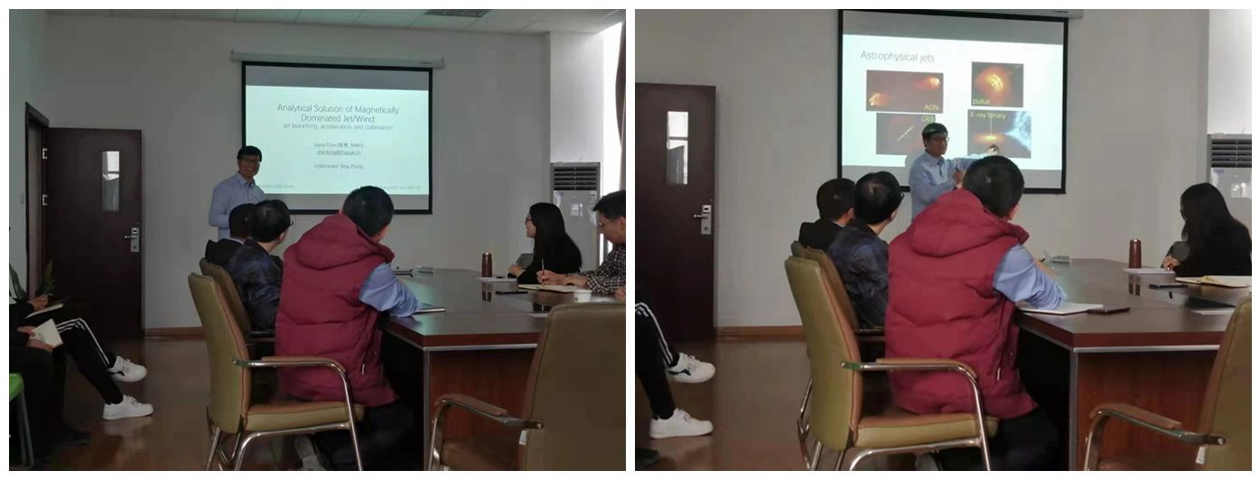 在本次报告会上,首先陈亮研究员讲解了宇宙喷流广泛存在于不同的天体物理环境中,而其加速机制和准直问题尚未解决。之后说明了为了便于理解目前丰富的观测结果,通过分离磁主导喷流理论方程的旋转和非旋转项,求解出了描述磁主导喷流的通用解析方程。详细介绍了基于此解模型可以解释喷流观测和数值模拟的主要结果,如喷流形状结构、喷流速度和加速机制、偏振特征、电荷和喷流功率、喷流动力学、黑洞喷流的物理起源等。陈亮研究员的报告深入浅出,尤其是介绍了电动力学在理解和解释宇宙极端喷流现象的作用,强调了物理专业课程学习的重要性,具有一定的启发性。报告会结束后,与会的各位老师和同学就自己关心的问题与陈亮研究员展开了热烈讨论和详细交流。