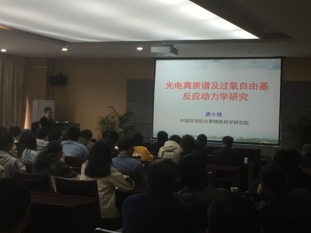 在本次报告会中,唐小锋研究员首先对“光电离质谱及过氧自由基反应动力学”的研究背景进行了介绍。随后,他详细介绍了自由基反应动力学研究和过氧自由基同分异构体检测等方面的具体工作,并向与会师生介绍了他所领导的课题组自行研制的光电离质谱仪器。唐小锋研究员鼓励在场同学打好专业基础,开阔学术视野,争取在科学研究领域做出开创性的工作。报告结束后,多位老师和同学就自己关心的问题与唐小锋研究员展开了热烈讨论和详细交流。