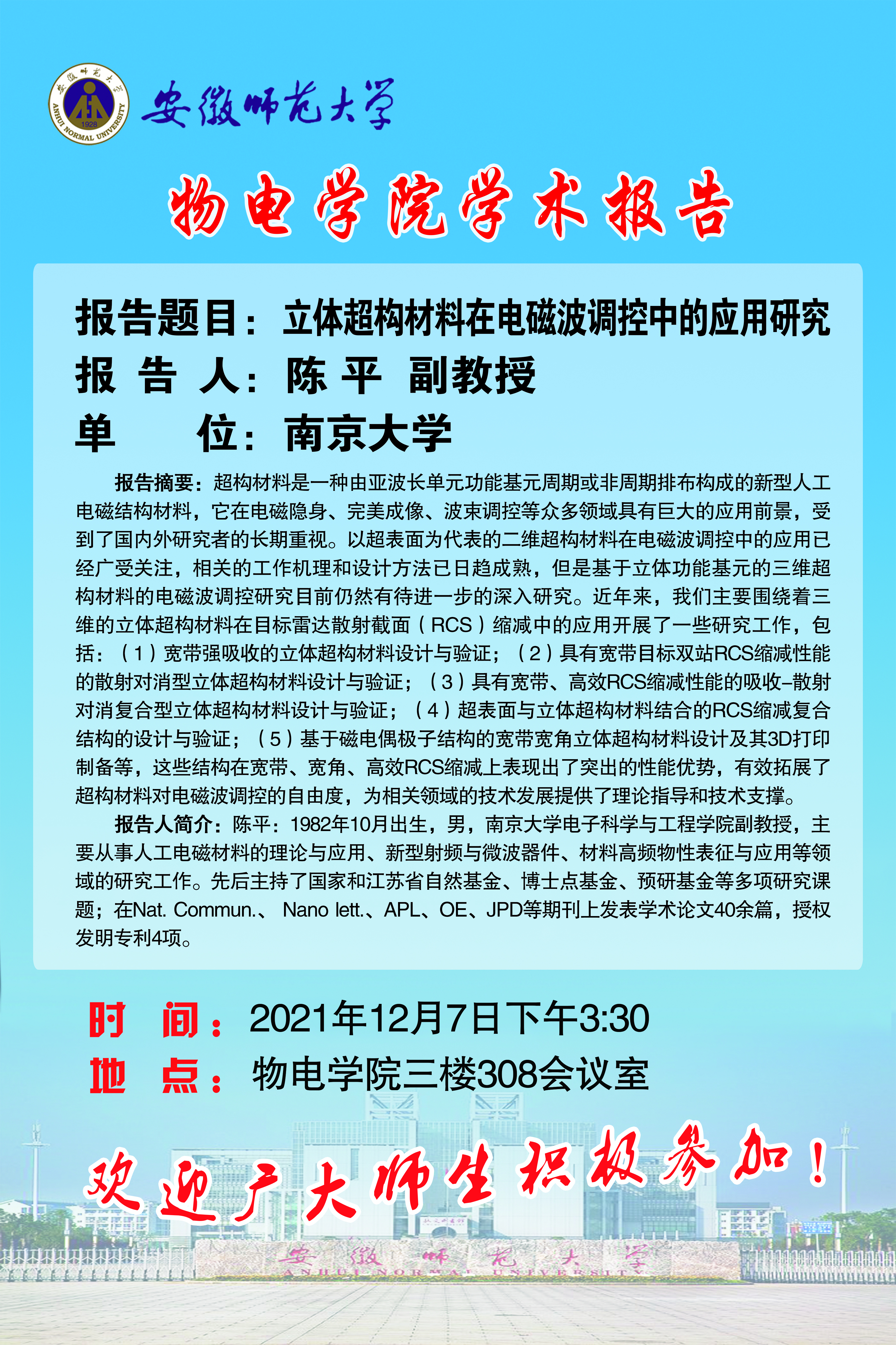 【学术预告】陈平:立体超构材料在电磁波调控中的应用研究