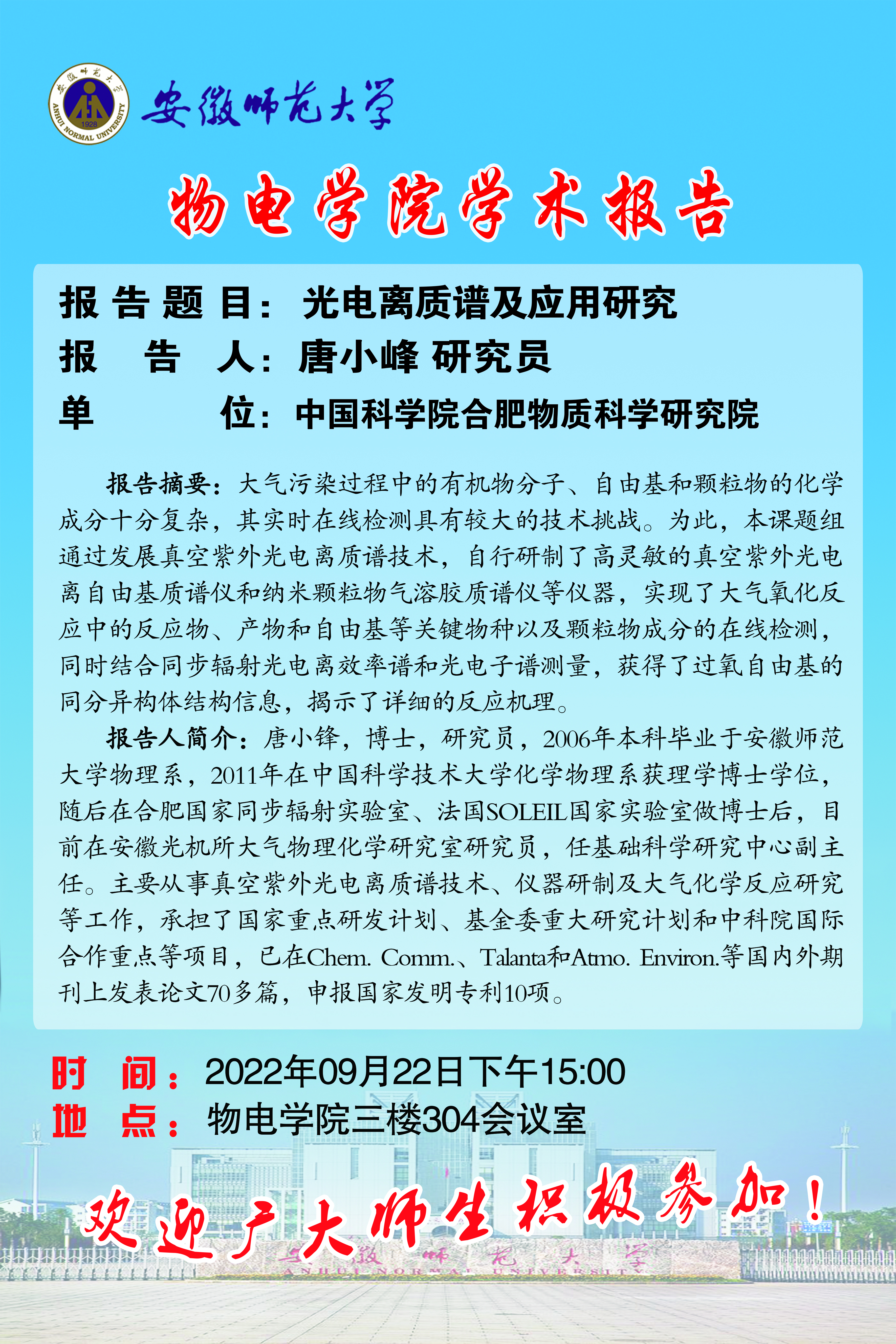 【学术预告·物电讲坛】唐小峰:光电离质谱及应用研究