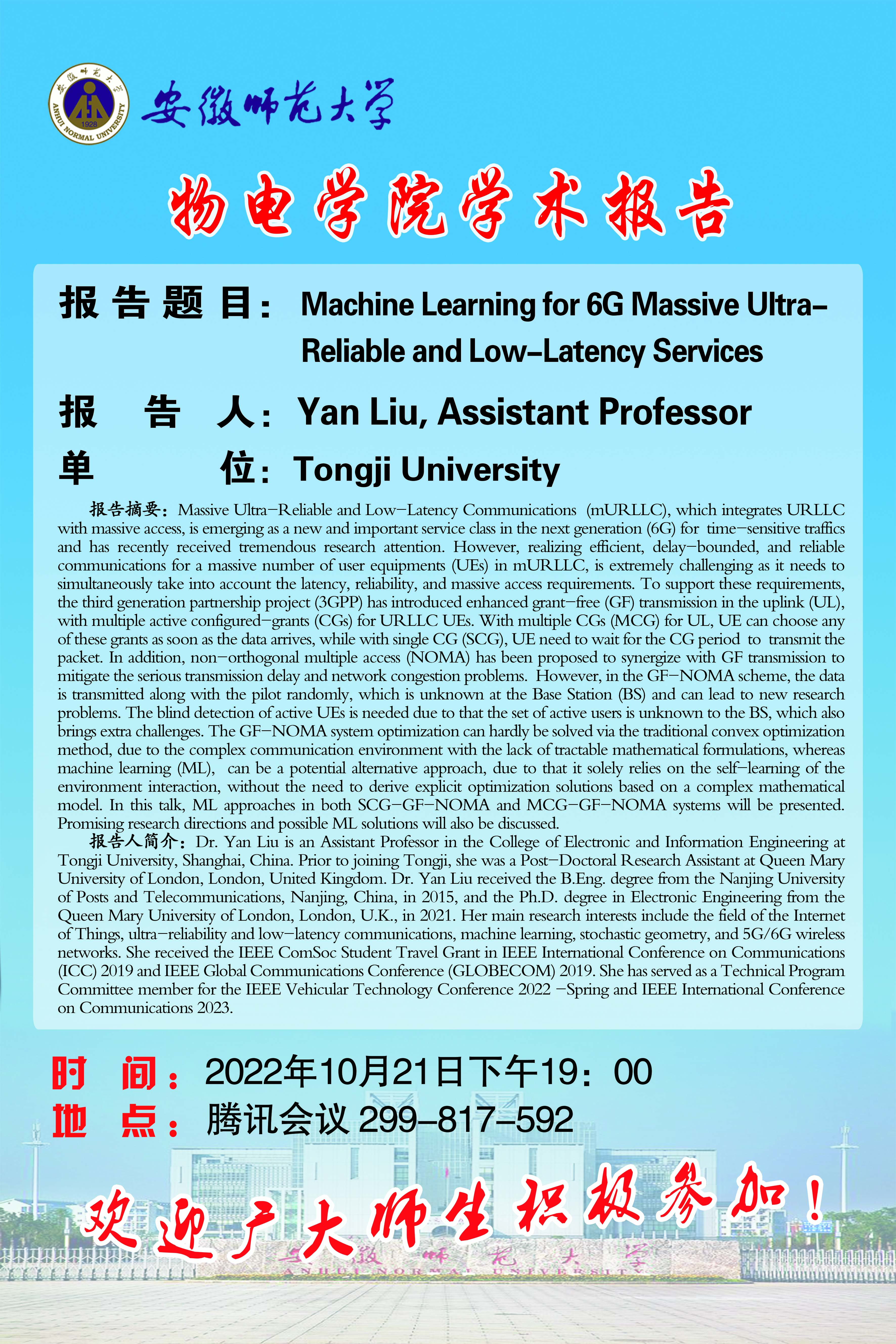 【学术预告·物电讲坛】Yan Liu:Machine Learning for 6G Massive Ultra-Reliable and Low-Latency Services
