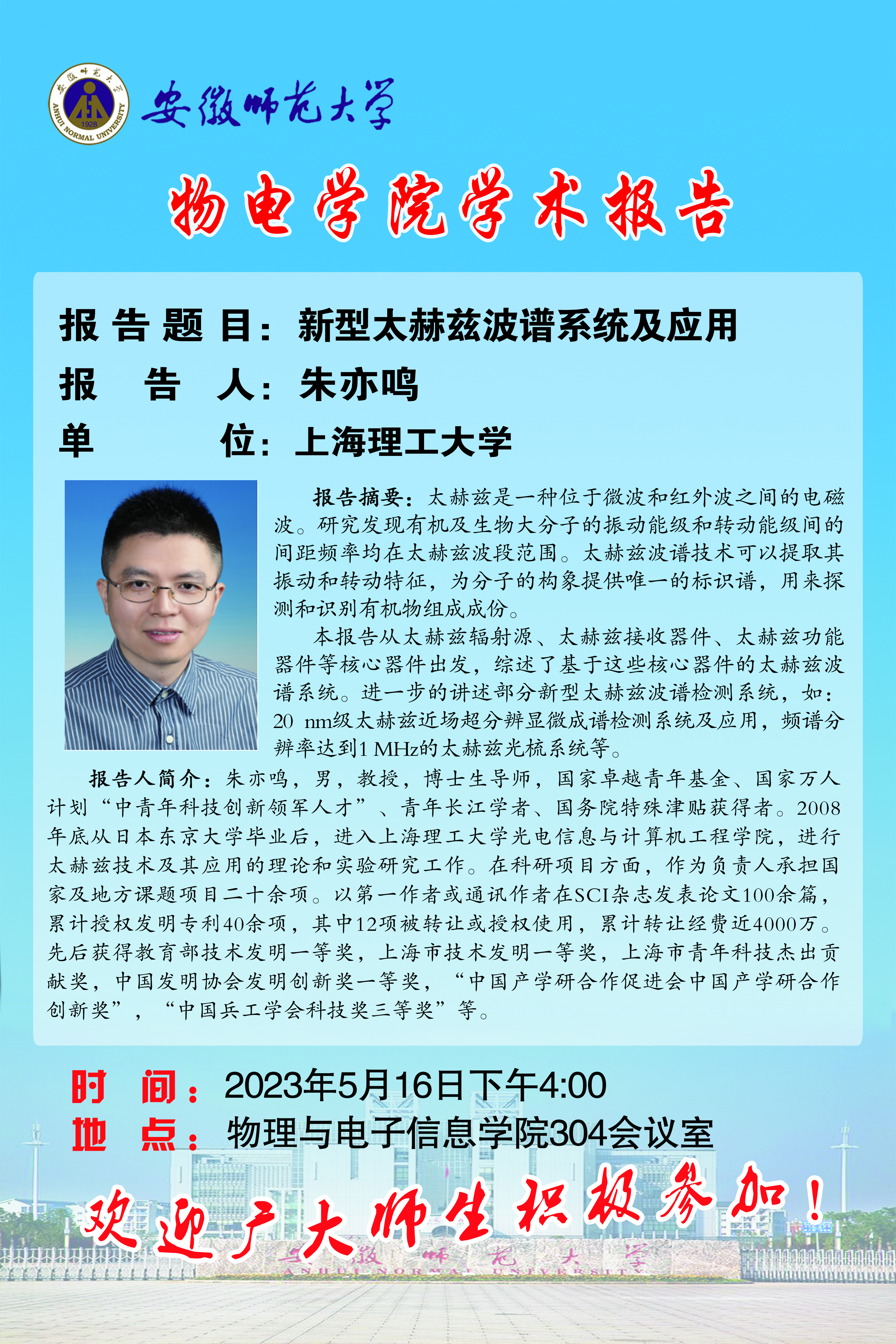 【学术预告·物电讲坛】朱亦鸣:新型太赫兹波谱系统及应用