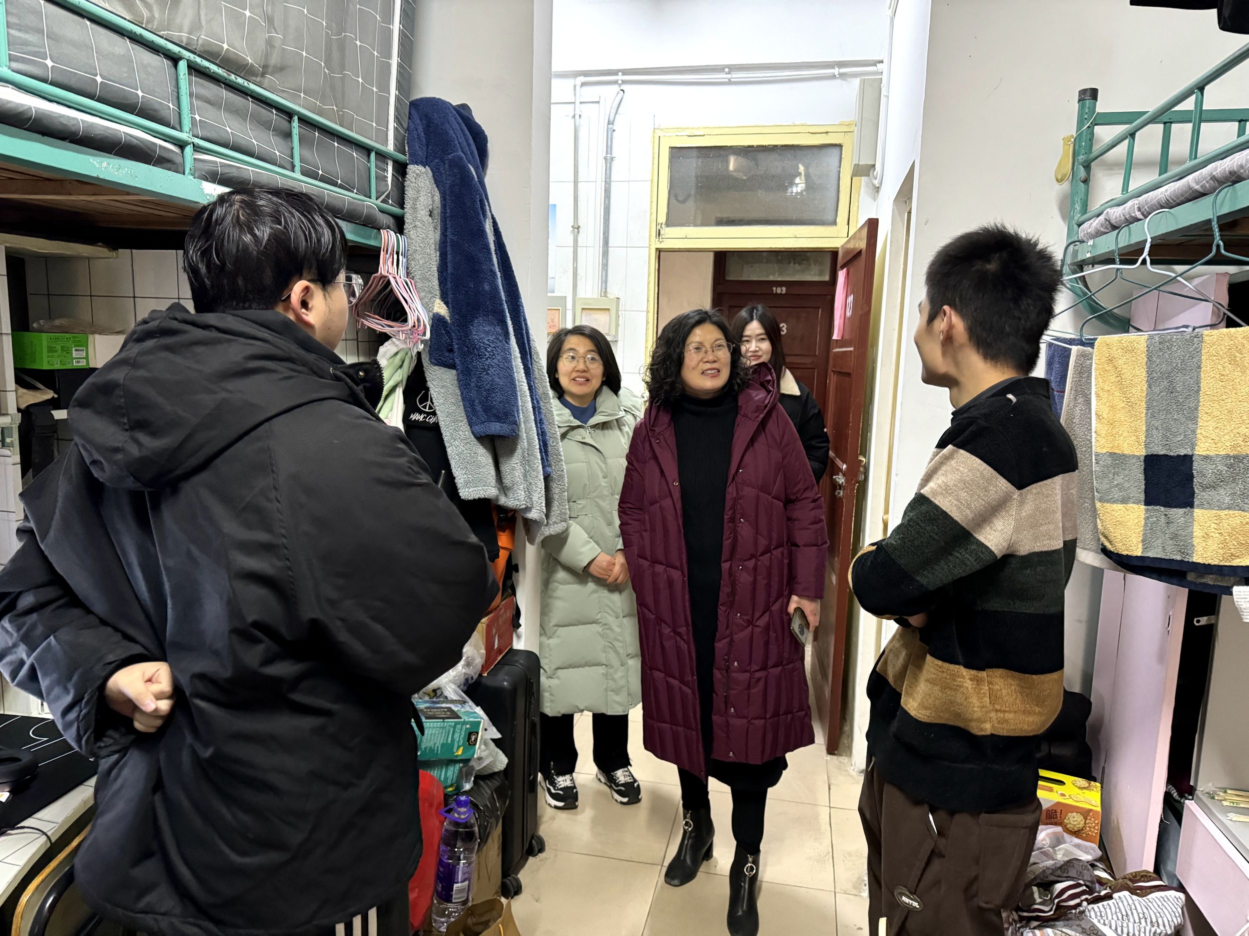 育人到寝,情暖入心。学生开学报到第一天,学院领导班子、辅导员深入学生宿舍进行走访,给学生送去新年祝福与希冀。学院在慰问学生之余,及时了解学生思想、学习、生活中的困难。特别提醒学生返校后要严格遵守学校安全、学习等相关规定,做到“人到校,心归位”,以崭新的姿态和昂扬的斗志投身到新学期的学习生活中。