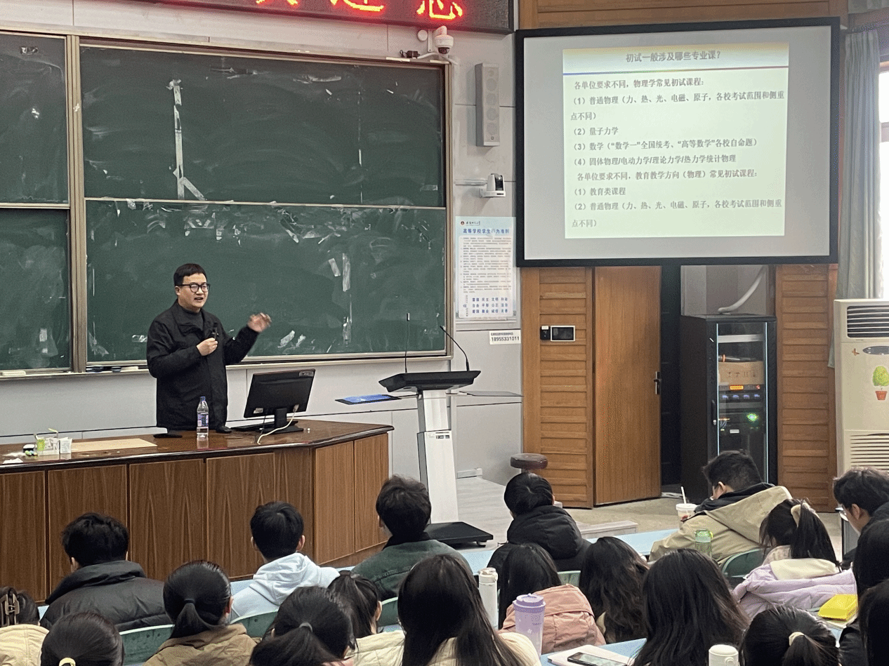 在1号教学楼报告厅举行2025届物理学学生就业前置教育暨考研择校指导会。物理学(师范)专业负责人吕建平教授、全体2025届物理学拔尖人才班、物理学师范班以及全体辅导员参加会议。