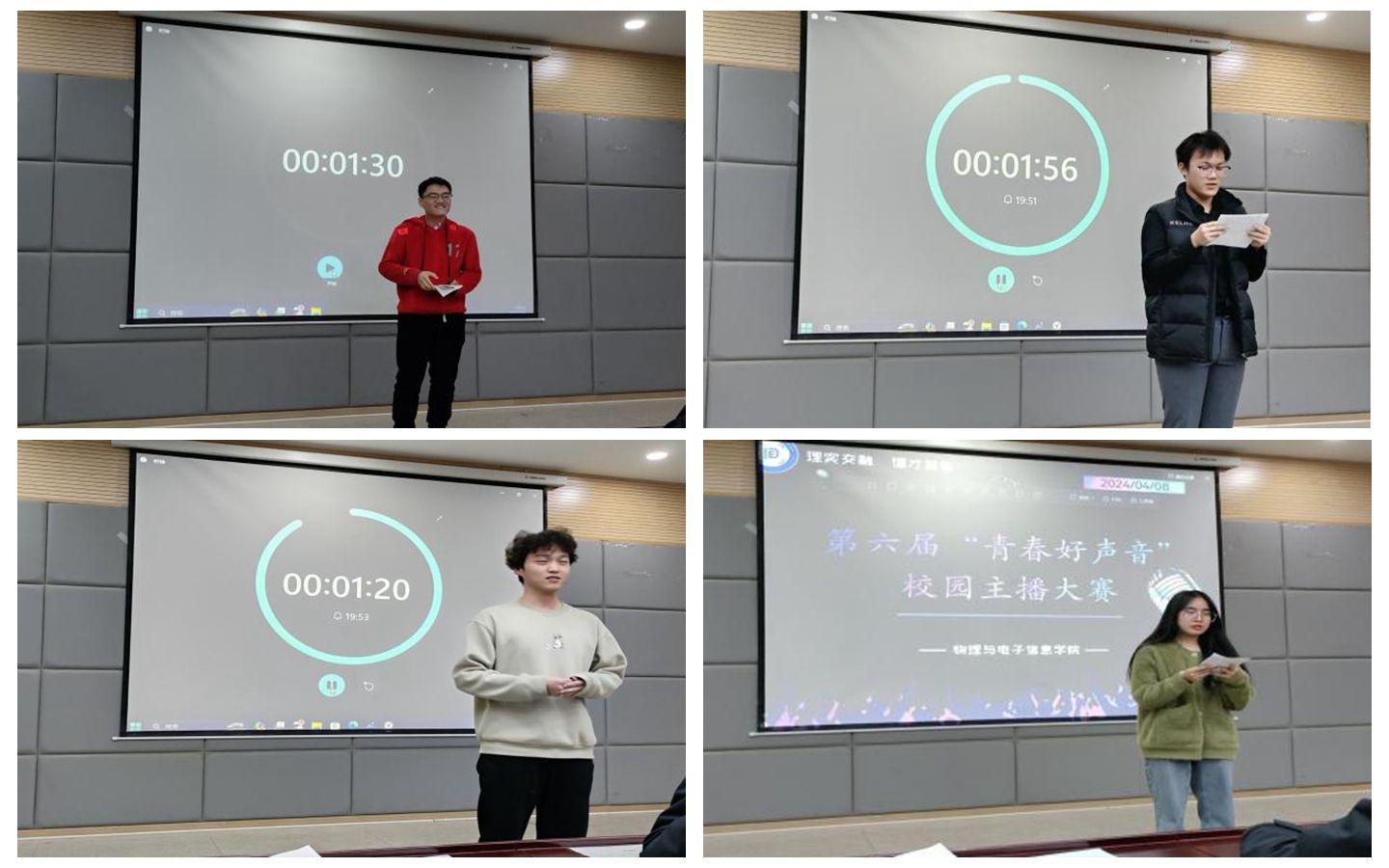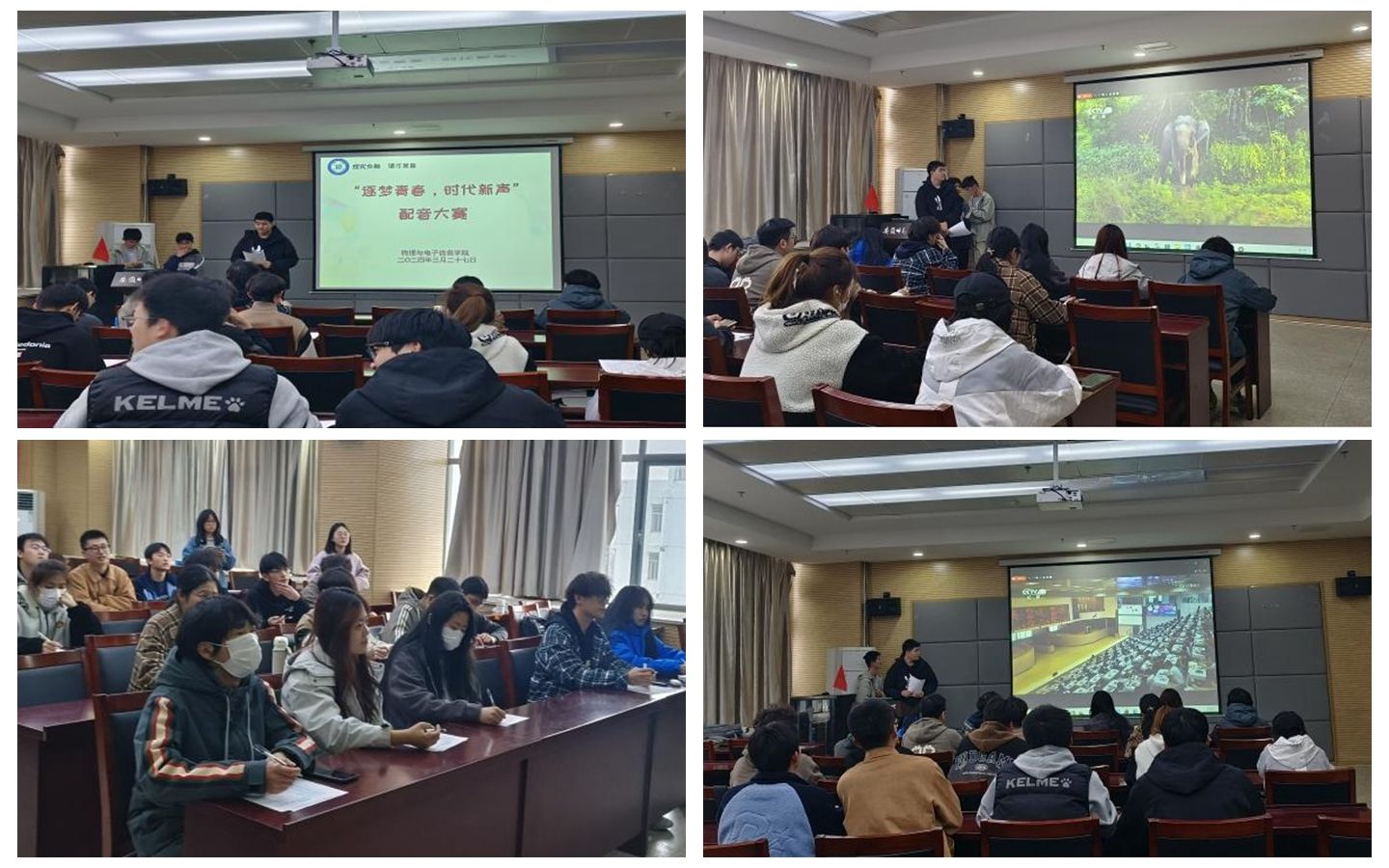 “逐梦青春,时代新声” 配音大赛于3月27日在物电楼335举办,由各班文娱委员担任本次大赛的评委。各组选手用声音诠释着角色的魅力。在《觉醒年代》《巾帼》等红色题材配音作品中,同学们将浓浓爱国情,拳拳报国心展现的淋漓尽致;《星际穿越》《流浪地球》等科幻题材配音作品展示了同学们对科学的热爱以及强烈的家国主义情怀;《三国演义》《茶馆》等著名影视作品的演绎,参赛选手们根据各自立意新颖、风格独特的参赛作品,充分发挥自身语言特长,凭借精准的发音和饱满的感情,以声传情,以情感人,用精彩的声音演绎多彩的剧情,带领现场观众们沉浸式体验影视作品,为经典赋予了新的生命。