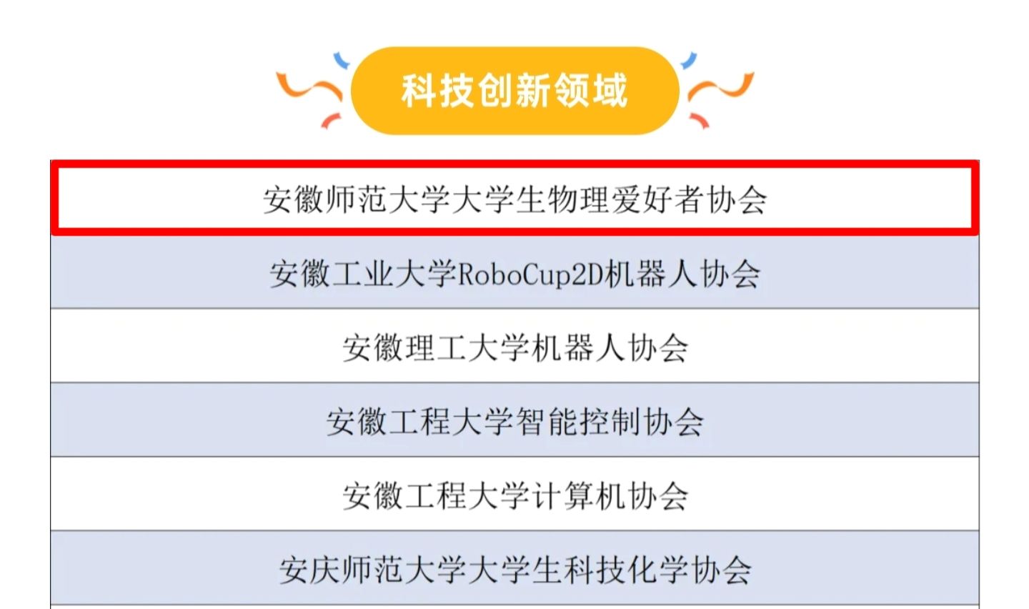 近日,2023-2024学年安徽省高校联通杯“活力社团”TOP100榜名单公示。大学生物理爱好者协会以科技创新领域排名第一的好成绩入选安徽省高校“活力社团”TOP100榜。