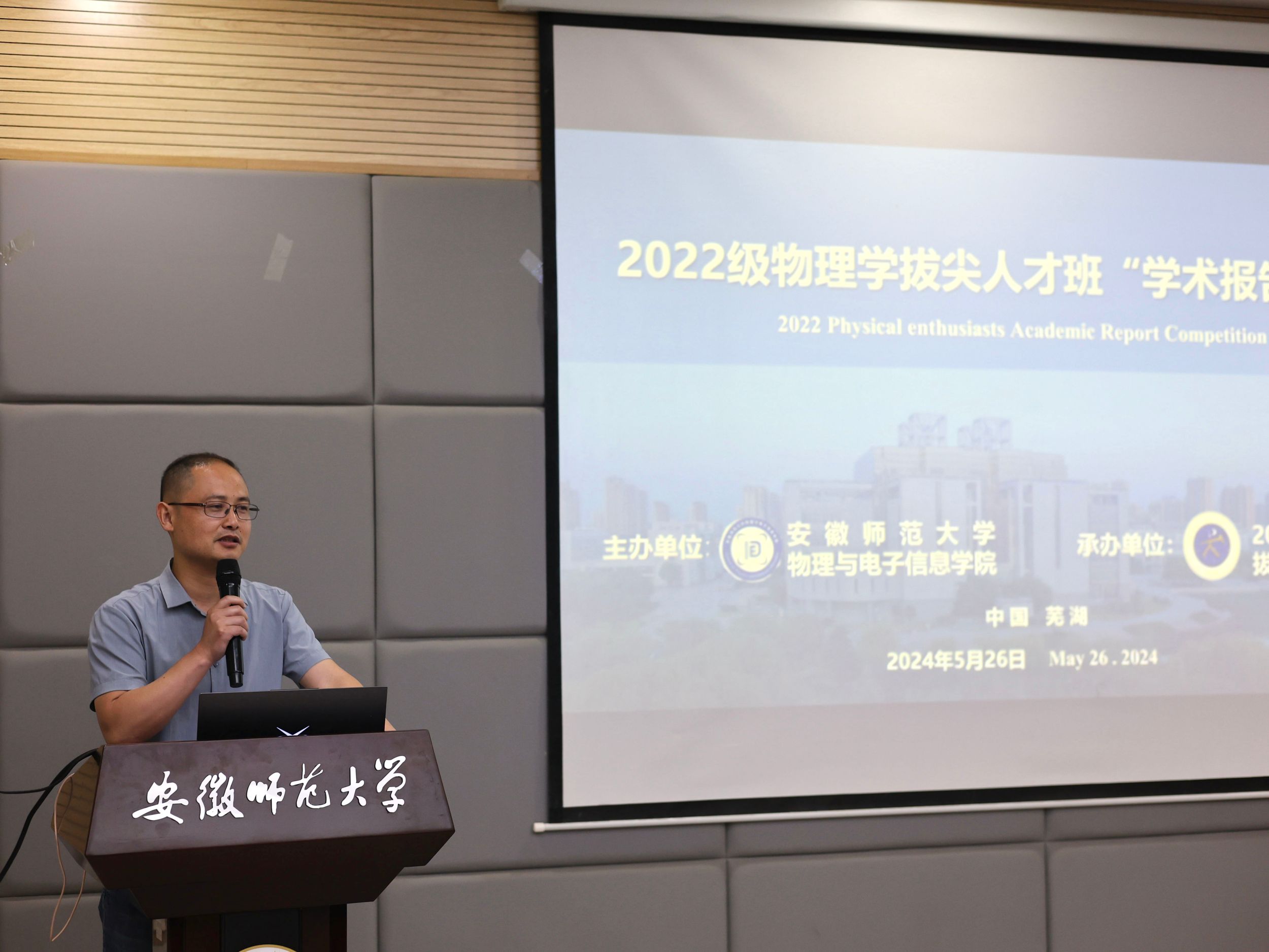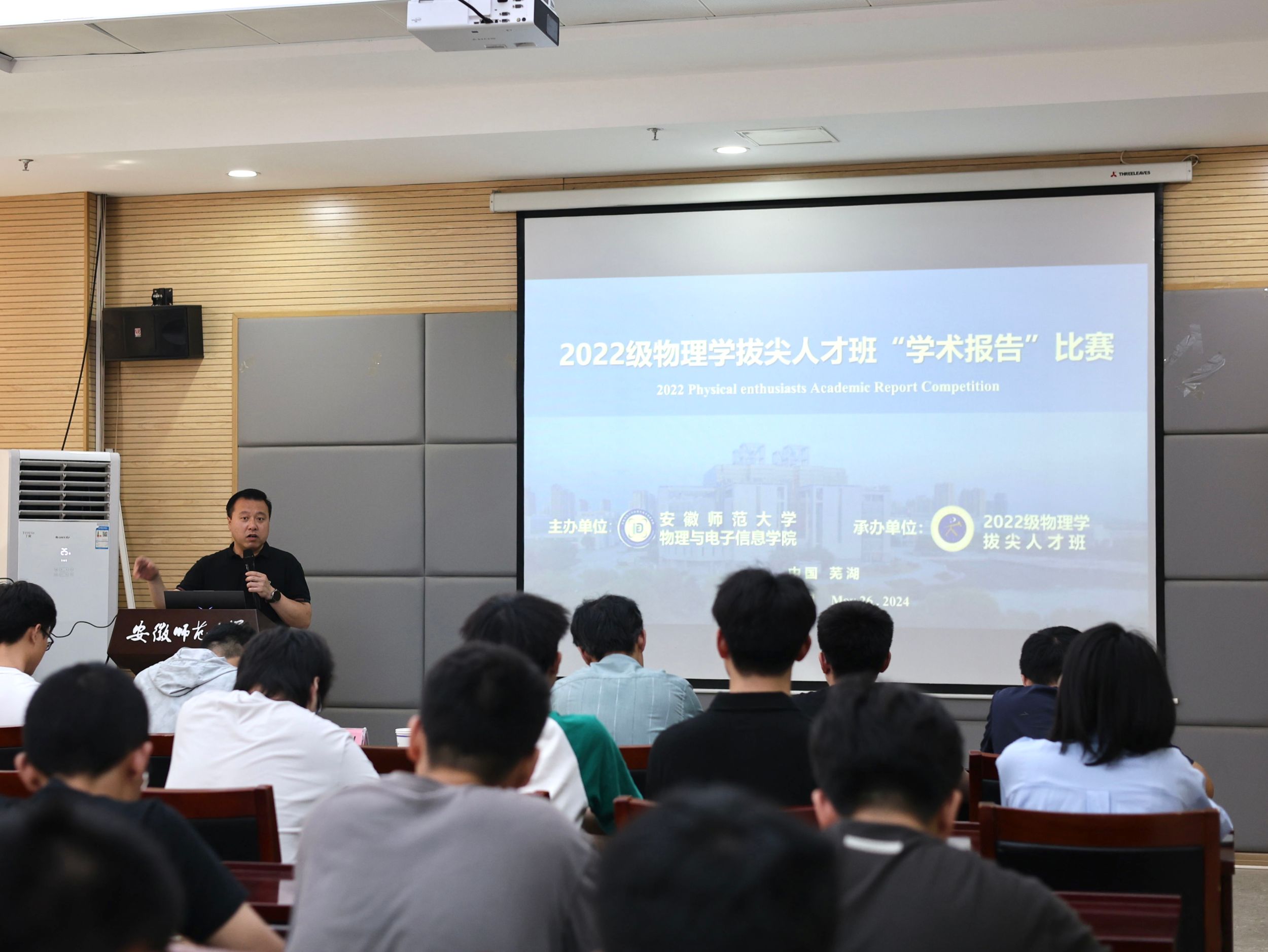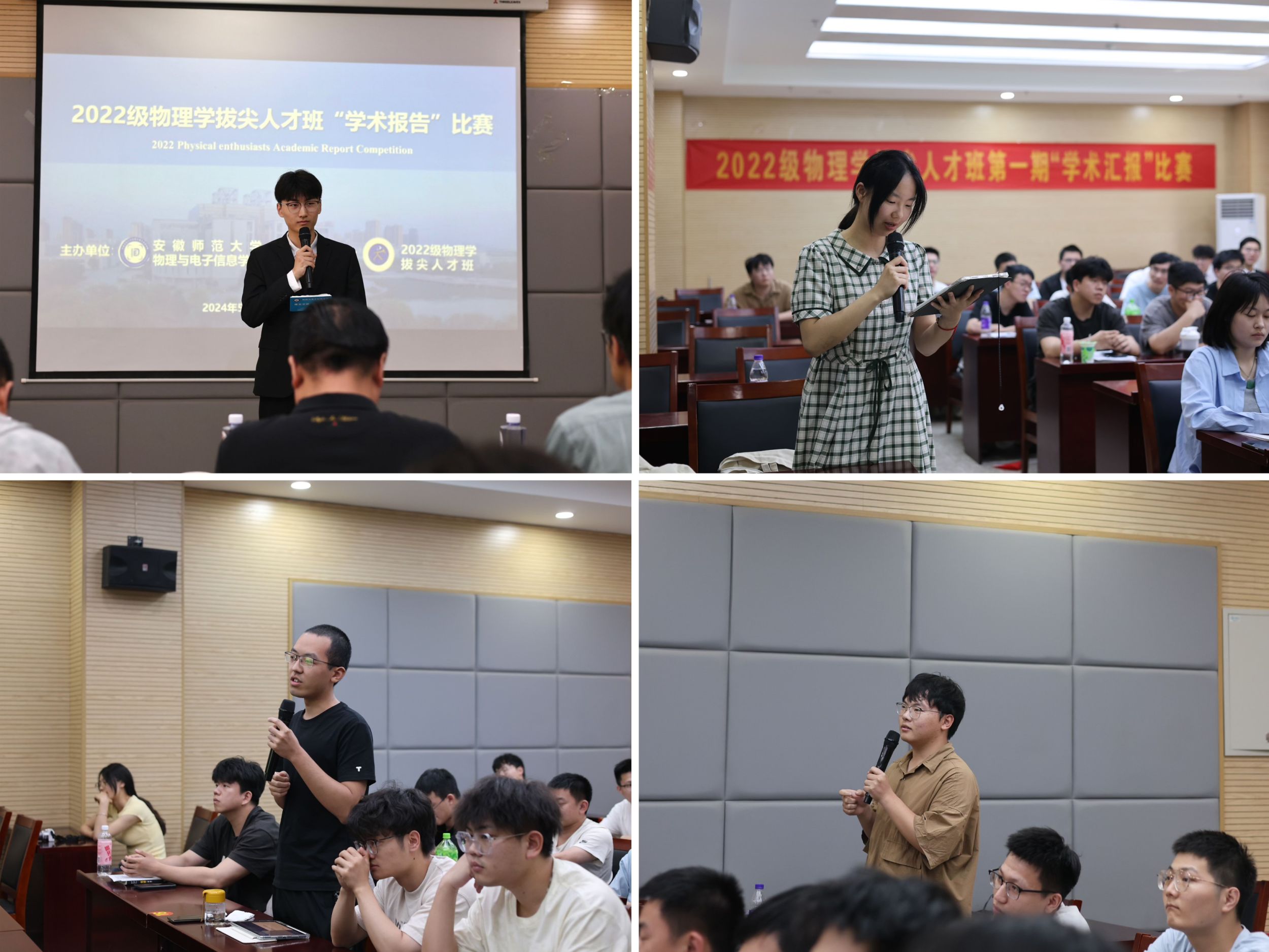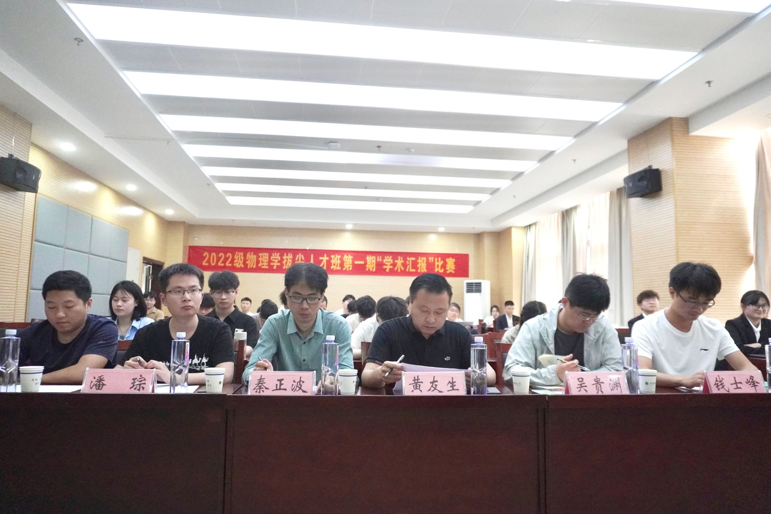 在物理楼335举办第五届物理学拔尖人才班“学术汇报”比赛,学院党委副书记黄友生、院物理学平台专业老师秦正波、吴贵渊、徐飞、潘琮、钱士峰担任评委,2022级物理学拔尖人才班赵文涵同学主持比赛,2022级物理学拔尖人才班全体同学观摩比赛。