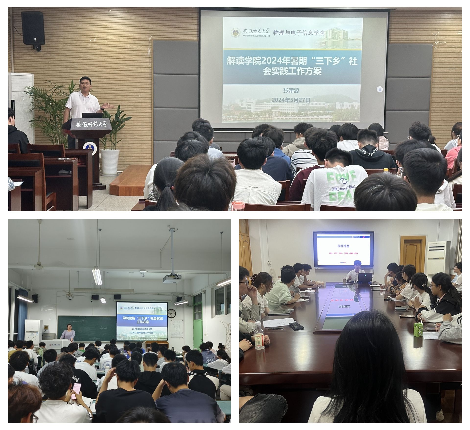 为确保暑期社会实践活动高质量完成,学院于5月30日与6月2日晚先后在物电楼304会议室召开2024年暑期“三下乡”社会实践动员与培训大会,培训会围绕团队组建、团队申报、团队管理、团队宣传、团队安全等方面开展,保障暑期“三下乡”社会实践活动顺利开展,并且各班级辅导员深入教室以主题班会的方式详细解读了学院“三下乡”暑期社会实践工作方案。