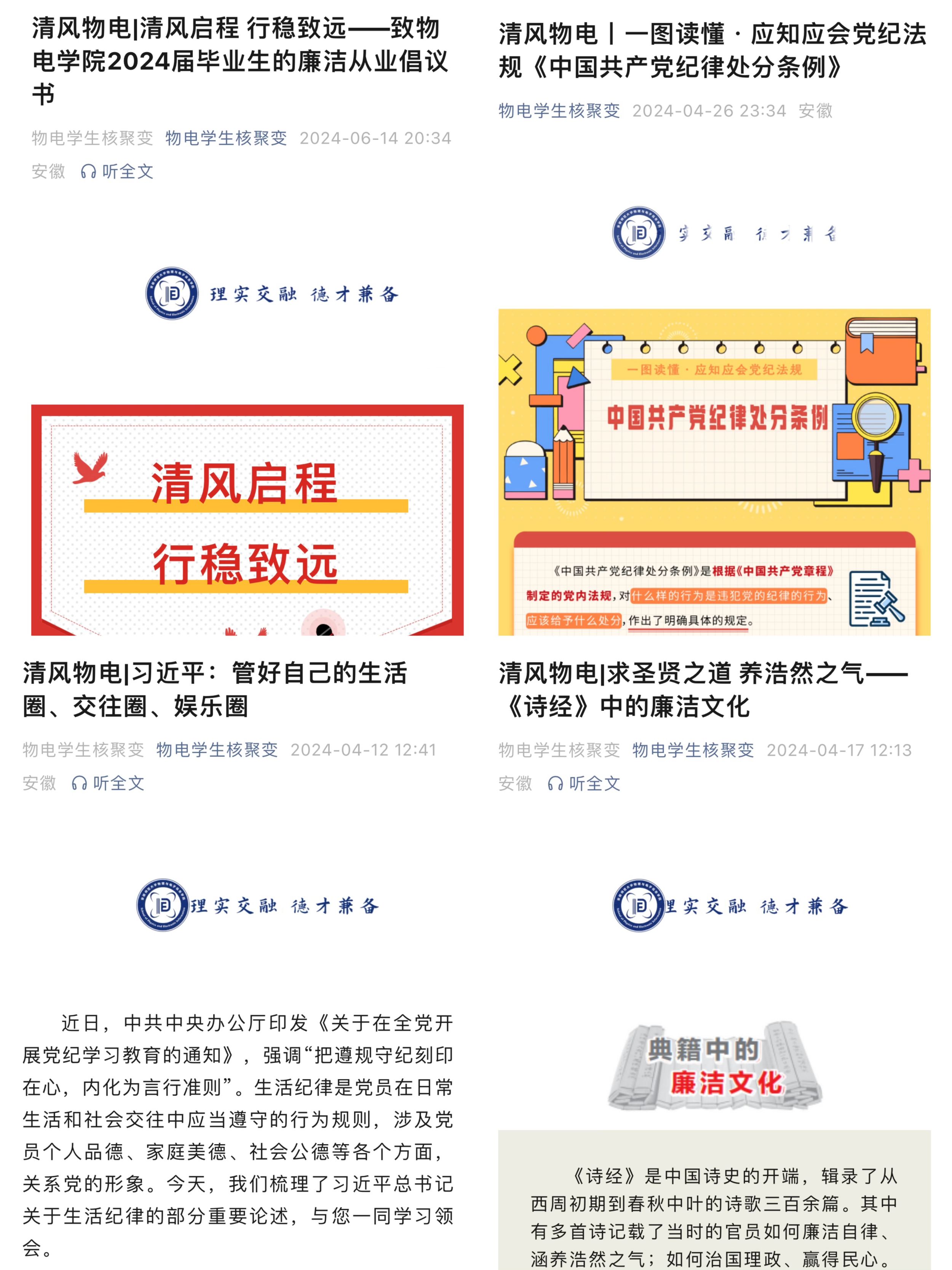 2024届毕业生的廉洁从业倡议书》,定期在“清风物电”专栏推送清廉推文,厚植清廉之风润泽校园,不断夯实毕业生清正廉洁的思想根基。