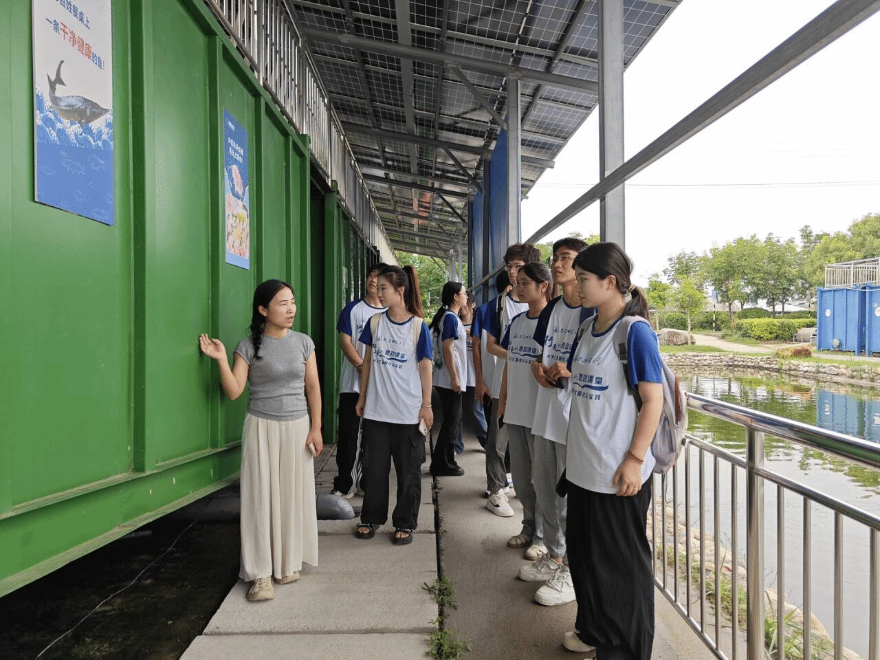 7月10日下午,在双浮镇宋镇长的带领下队员们参观了太和县双浮镇有机良庄。在这里,首创了国内第一家“新型鱼菜生态循环技术”,实现了以集装箱为载,高密度、循环水为核心特色的种养新模式——箱式农业。队员们看到,数十个集装箱内养殖着草鱼、鲟鱼、锦鲤等十多个品种的鱼苗,鱼粪和废水通过闭环管道输往蔬菜大棚,经蔬菜、瓜果吸收氨氮、补充溶氧量后,返回集装箱继续供养鱼使用。有机良庄创始人创立的本意便是积极响应乡村振兴战略,帮助家乡人民脱贫致富。多年来,不忘初心,在提高企业自身实力的同时,也对太和县乃至阜阳市现代农业进一步提质升级起到积极的促进作用。我们团队成员深受鼓舞,决心将这份对乡村振兴事业的热情与关注延续下去,用实际行动为这片热土贡献我们的智慧与力量,共同绘制出一幅幅乡村振兴的美丽画卷。