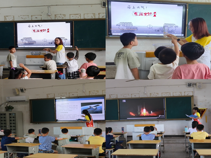 调研组走进支教队员们的“金苹果”科普课堂,观摩科普小实验。来自2023级物理学(师范)专业的朱雨婷以《气压喷泉》为主题,通过控制不同部分的水位和连接方式,实现水的喷发效果。在实验中,较长的吸管利用小孔插入下方的瓶子内,完成后的装置在倒置时,水通过吸管流动,形成喷泉的效果,让孩子们生动形象的理解了压力平衡的原理,将物理与生活现象相结合,激发了孩子们对于科学的兴趣。调研组走进“理想江淮”微宣讲小课堂,宣讲团带来了题为《航天航空精神》《焦裕禄精神》《浪尖上的逆行者》等系列宣讲。