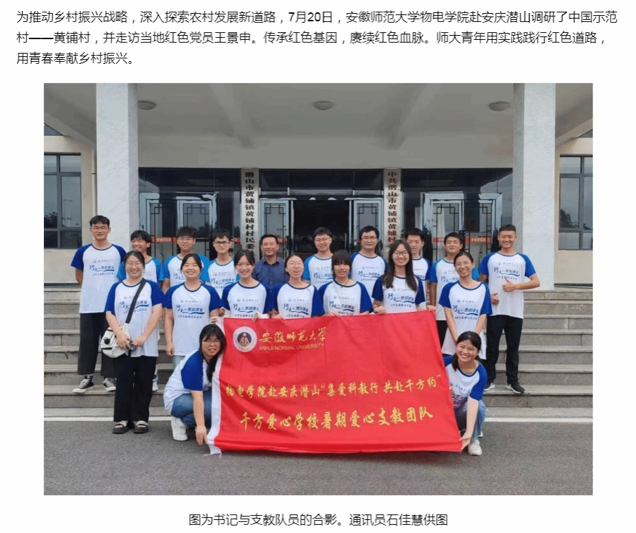 赴安庆潜山调研了中国示范村——黄铺村,并走访当地红色党员王景申。传承红色基因,赓续红色血脉。师大青年用实践践行红色道路,用青春奉献乡村振兴。