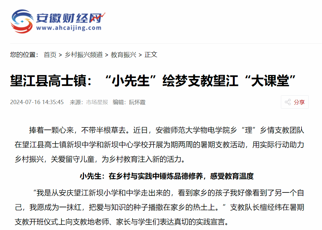 当“小先生”走进基层乡村的“大课堂”,既是教学者,也是学习者。接下来,团队将继续在安庆望江新坝镇开展乡“理”乡情支教志愿服务活动,将个人所学运用于实际教学,在实践中受教育、爱教育、懂教育,以乡村教育振兴为引擎,为新农村建设注入发展动力。(周经晶 檀经纬 王雨婷 万辰睿 潘析文)