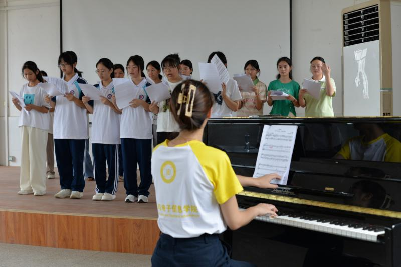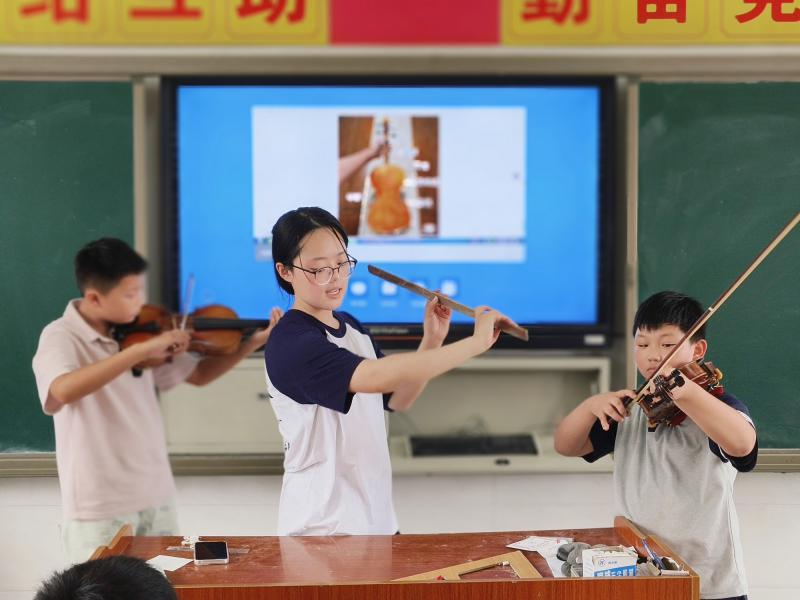 学生们排练大合唱节目大学生志愿者教授学生认识小提琴。