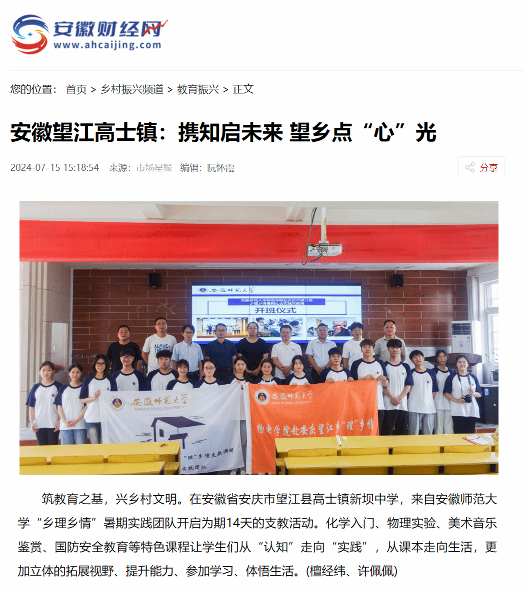 筑教育之基,兴乡村文明。在安徽省安庆市望江县高士镇新坝中学,来自安徽师范大学“乡理乡情”暑期实践团队开启为期14天的支教活动。化学入门、物理实验、美术音乐鉴赏、国防安全教育等特色课程让学生们从“认知”走向“实践”,从课本走向生活,更加立体的拓展视野、提升能力、参加学习、体悟生活。(檀经纬、许佩佩)