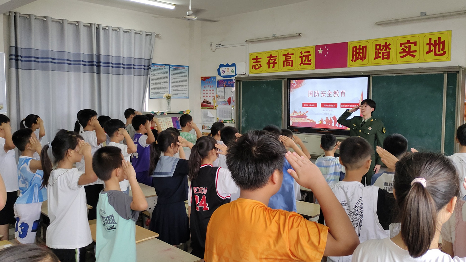 退伍军人、乡“理”乡情暑期实践团队员潘析文在2020年至2022年服役于武警北京总队,曾参与北京冬奥会、全国两会安保工作,但穿着墨绿色的军装走上讲台当老师,他还是第一次。向国旗敬礼、讲参军故事、淬坚强意志、传红色基因……这一节国防教育课,潘析文讲得郑重,孩子们听得认真。