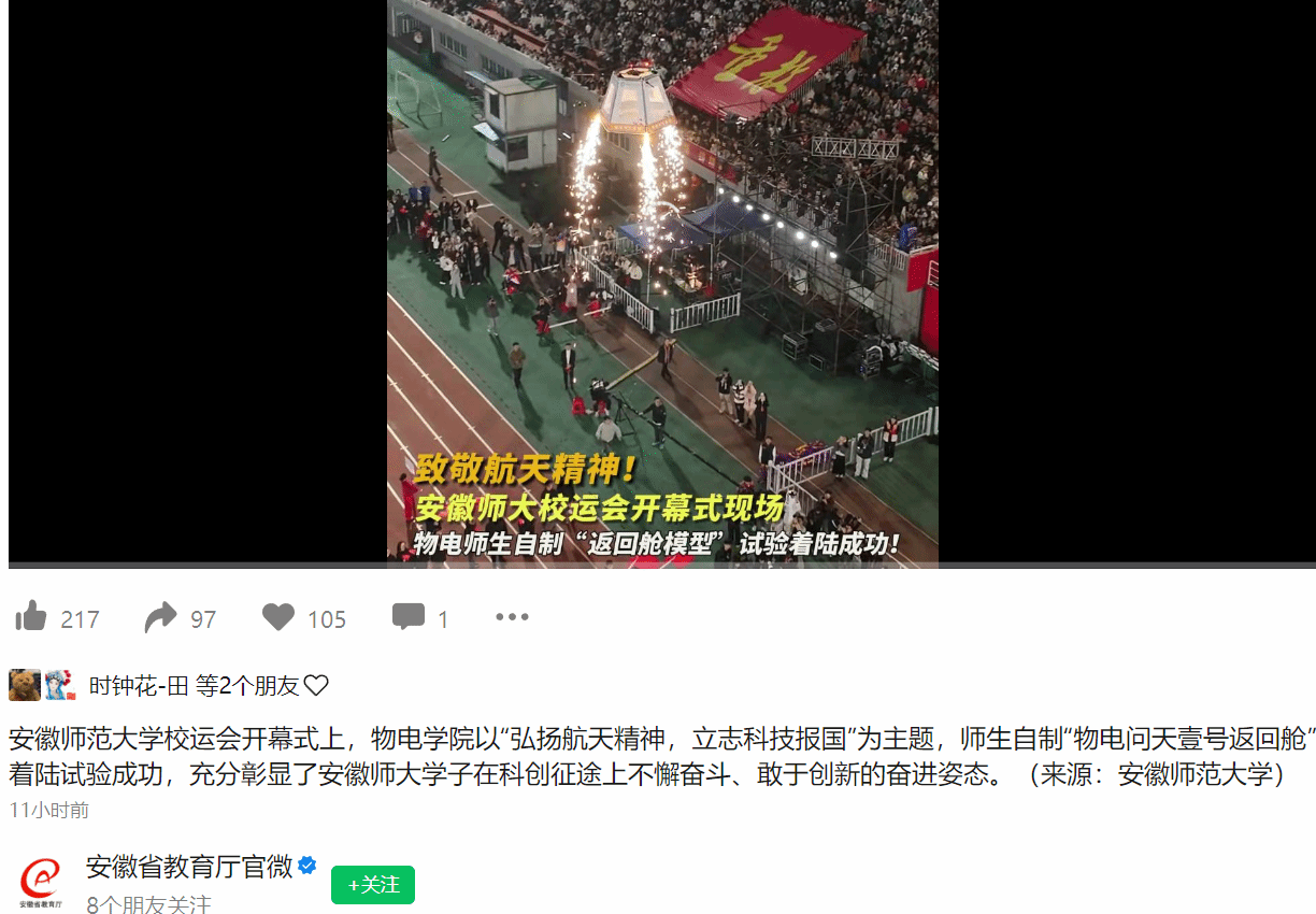 安徽师范大学校运会开幕式上,免费色情片 以“弘扬航天精神,立志科技报国”为主题,师生自制“物电问天壹号返回舱”着陆试验成功,充分彰显了安徽师大学子在科创征途上不懈奋斗、敢于创新的奋进姿态。