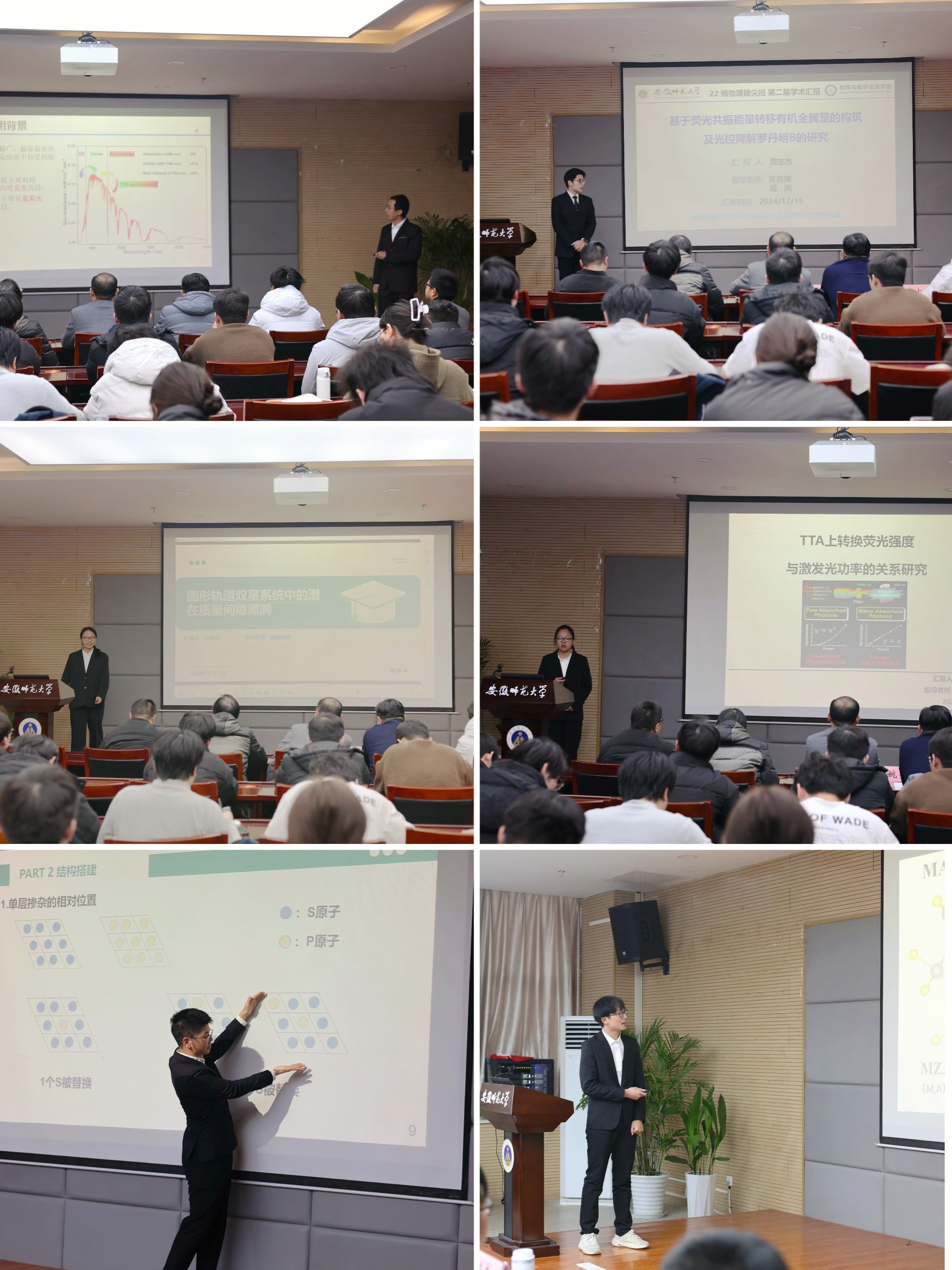 本次比赛通过现场汇报、评委点评、师生提问的方式进行,共有张益玮、贾志杰、汪韵彤、廖梦欣、周天翼、刘艺6位同学参与汇报,参赛同学依次上场展示了自己的科研训练结果。来自凝聚态物理平台的周天翼同学以课题《磷掺杂二维过渡金属硫族化合物vdW异质结的第一性原理研究》进行汇报,详细介绍了掺杂与结构搭建的原理及DFT计算工作。光学平台的贾志杰同学,经过非线性光谱与超快动力学研究组的实习训练,深入讨论了题为《基于荧光共振能量转移有机金属笼的构筑及光控降解罗丹明B的研究》的学术课题。原子与分子物理平台廖梦欣同学则通过对TTA上转换机制的深入理解,带来了题为《TTA上转换荧光强度与激发光功率的关系研究》的精彩汇报。评委老师对汇报同学的研究内容提供建议与指导,现场同学与选手提问交流互动。