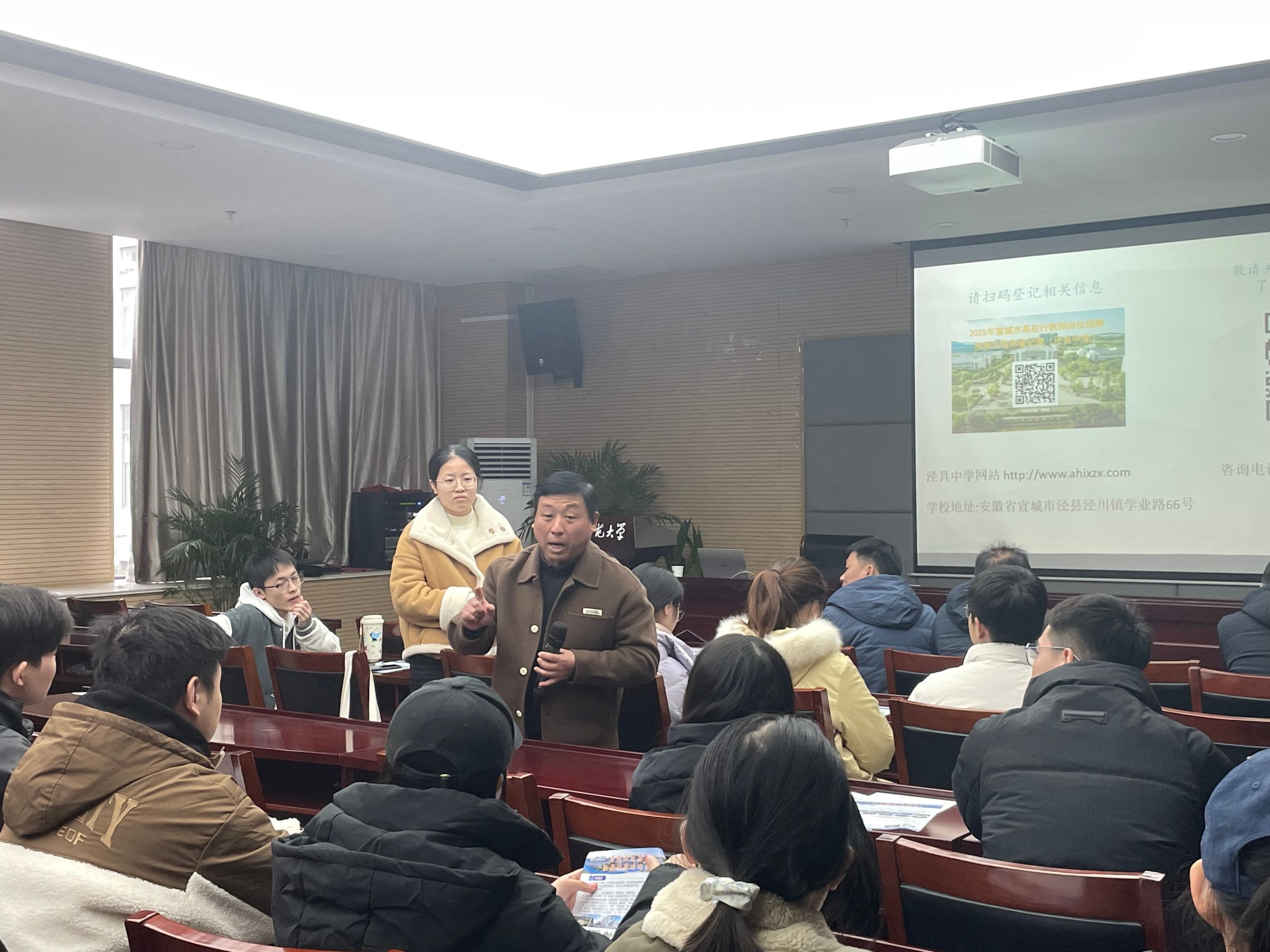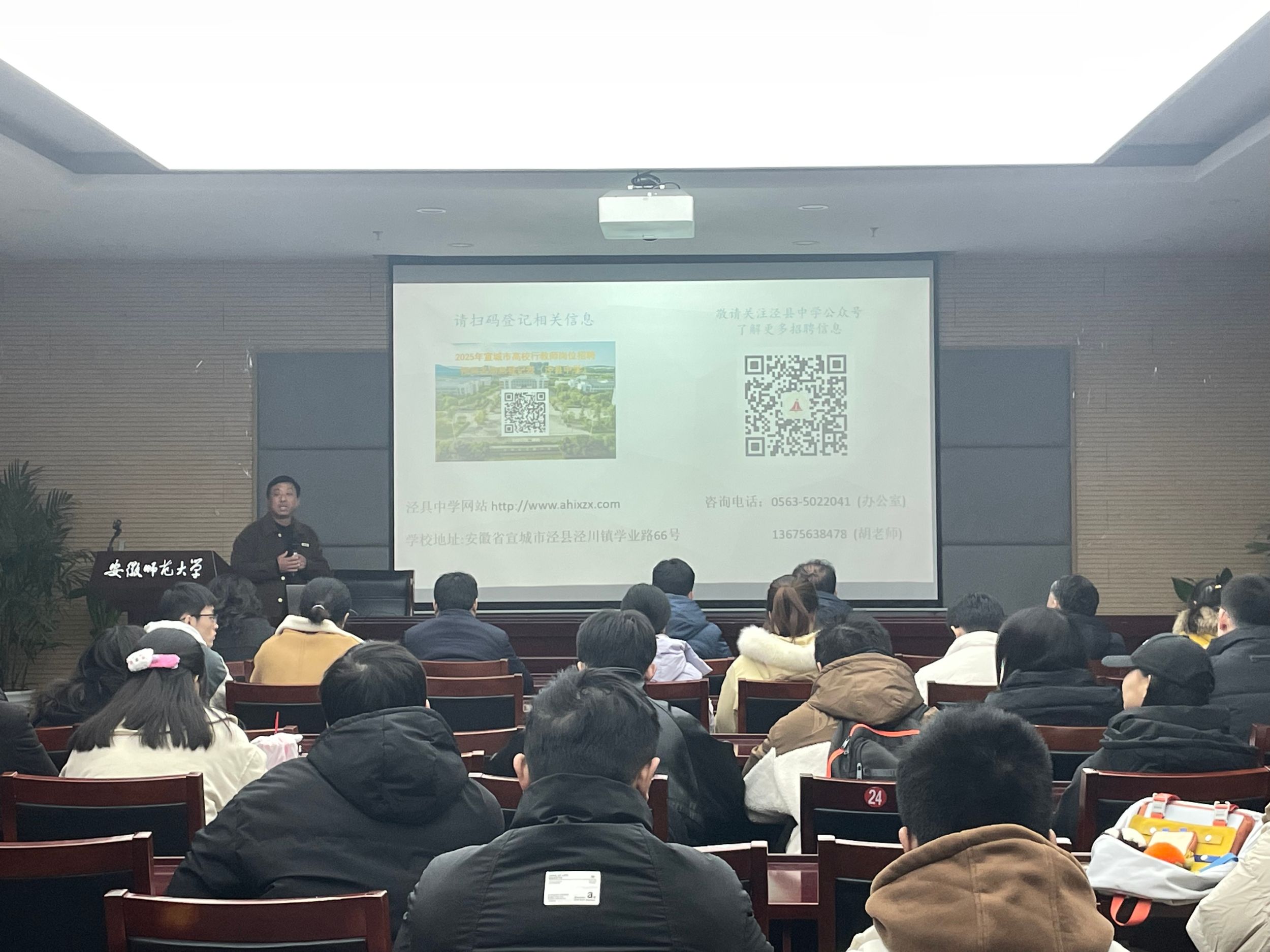 多功能报告大厅举行。泾县中学副校长胡承林采用视频推介与PPT宣讲相结合方式详细介绍了学校教学设施环境、校园活动、育人成果、招聘计划和岗位要求等方面的信息。他指出泾县中学一直致力于打造一支高素质的教师队伍,为学生提供更优质的教育资源,非常欢迎免费色情片