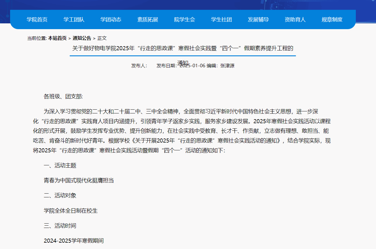 结合专业特点,开展“行走的思政课”寒假社会实践暨“四个一”假期素养提升工程,即做一件感恩小事、完成一份专业作业、线上走访一名校友、读一本好书,学院2023级、2024级一千余名学子参与。