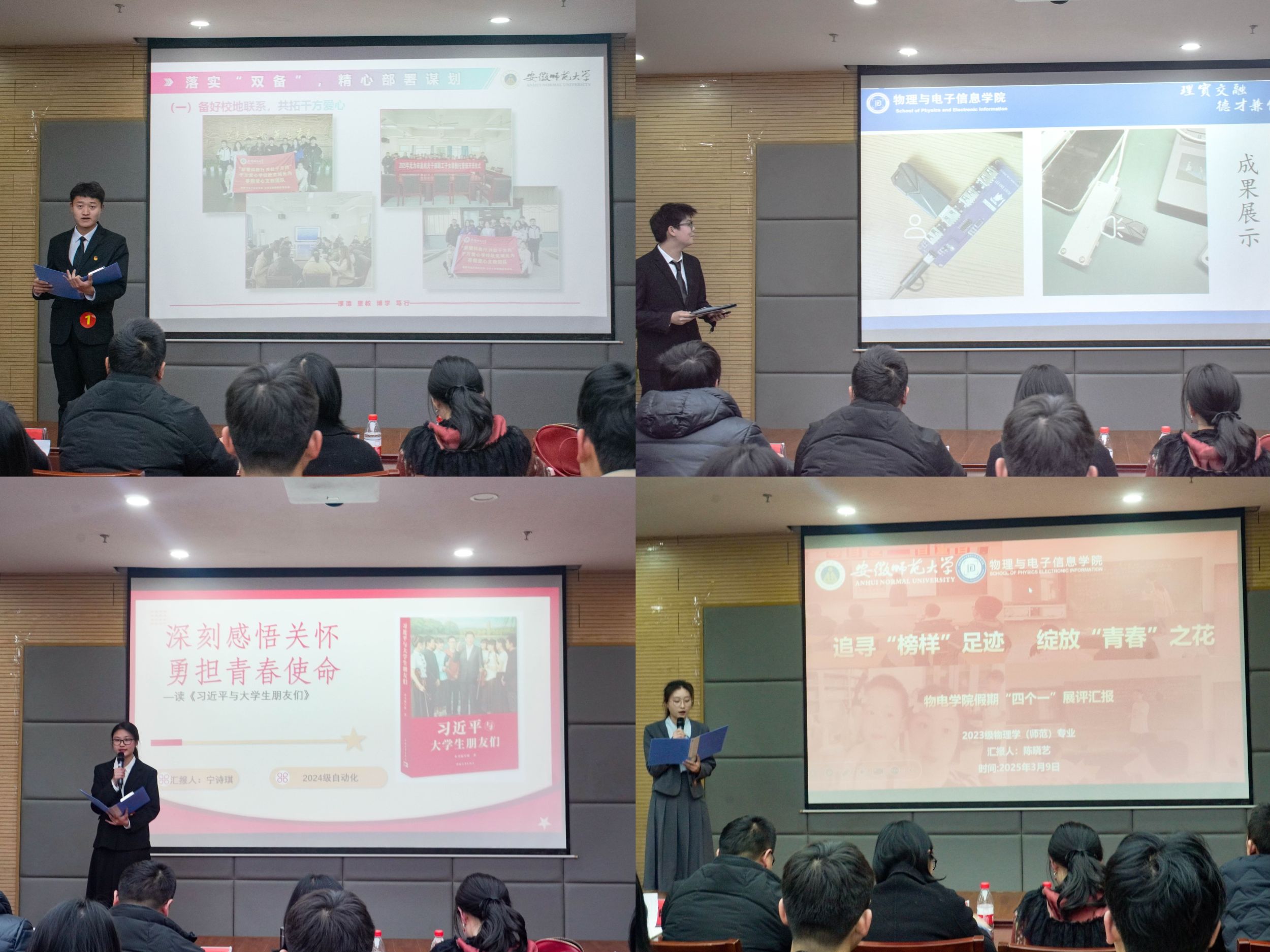 在寒假社会实践展示分享中,千方爱心学校赴无为市寒假爱心支教团队负责人从落实“双备”、躬身“四课”、突出“三效”等个方面分享实践团队的所见所得。在“四个一”展评交流会上,15位同学依次登台,分享寒假“四个一”自主实践成果。有同学利用专业知识制作出基于SL2.1A芯片的USB拓展坞、五子棋小游戏等,深化专业内涵;有同学化身志愿者深入社区、火车站、产业园等开展志愿服务活动,传递爱心温暖;有同学走访校友,深化认知、汲取经验、拓宽视野,传承榜样力量;有同学通过阅读《习近平与大学生朋友们》《梁家河》等书籍涵养心灵,汲取精神伟力。