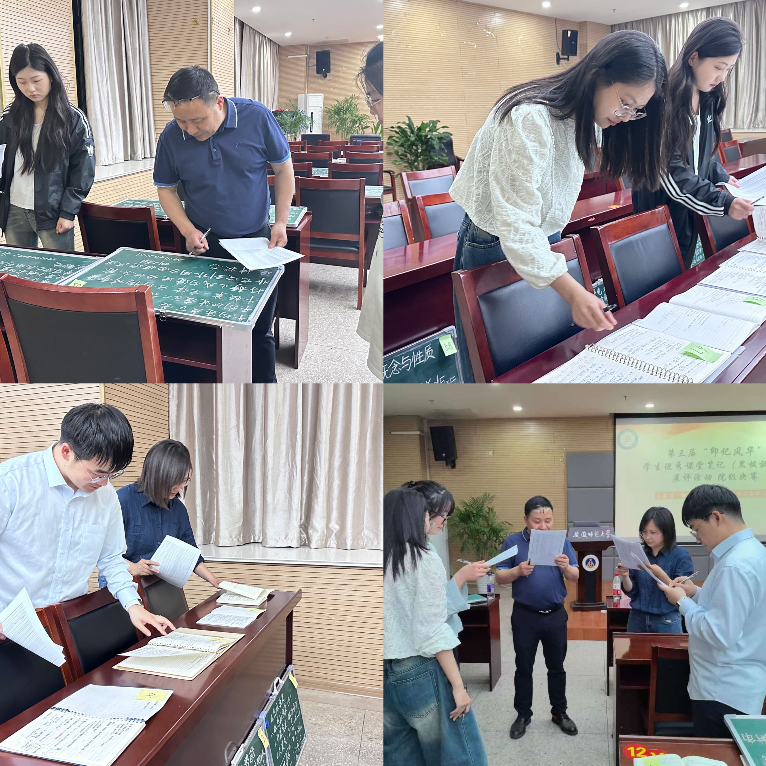 笔下芳华,笔尖梦想。为加强优良学风建设,深入推进大学生护航行动计划,以优秀笔记作品领航学院学生进一步掌握课堂笔记知识整理和师范生板书设计等专业技能。4月16日,学院在物电楼304会议室举办第三届“印记风华”学生优秀课堂笔记(黑板板书)展评活动。物理系副主任、物理教师教育教研室主任汪志荣老师,物理学专业教师徐玲、童大振老师,学院团委副书记、学生会指导教师邹孝龙老师,优秀学生代表许冉冉、汪彤受邀担任评委。