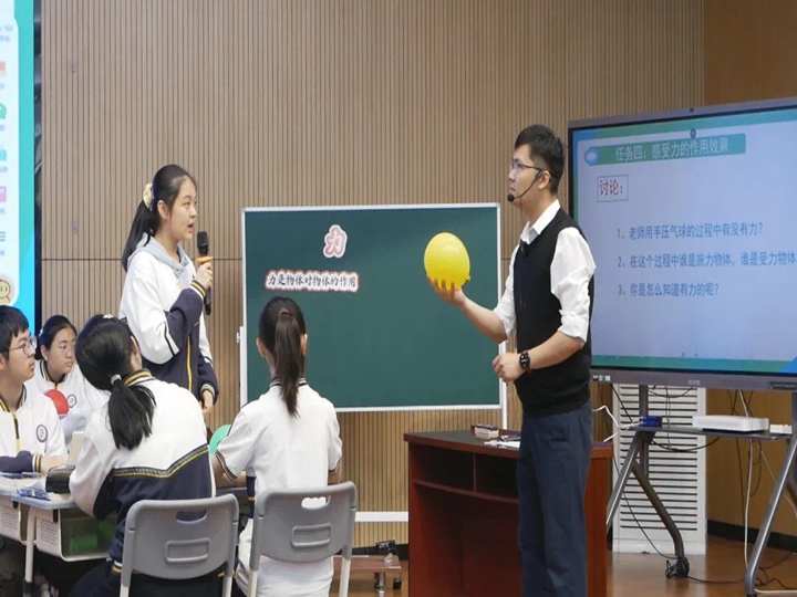 来自芜湖市第二十九中学华强校区的胡光彬老师展示了人教版八年级《力》这节课。胡老师以创新设计与多元互动打造高效课堂。教学采用项目式学习,创设“拔河比赛谁用力大” 真实情境,结合智慧课堂 “云互动”,利用生活实例、分组实验和 DIS 力传感器等教具,让学生直观感受力的作用效果与相互性,实现 “从生活走向物理,从物理走向社会” 的教学理念。课堂上,学生积极参与拔河模拟实验、分组探究活动,分享实验成果、参与答题互动。借助AI 技术与墨子的跨时空对话,更是让课堂小结充满趣味,有效激发学生对物理学科的探索热情,为力学知识学习奠定基础。