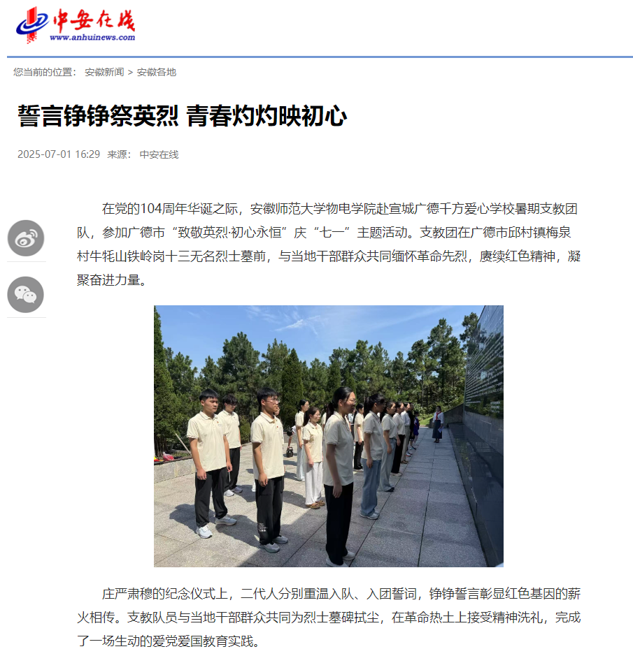 赴宣城广德千方爱心学校暑期支教团队,参加广德市“致敬英烈·初心永恒”庆“七一”主题活动。支教团在广德市邱村镇梅泉村牛牦山铁岭岗十三无名烈士墓前,与当地干部群众共同缅怀革命先烈,赓续红色精神,凝聚奋进力量。
