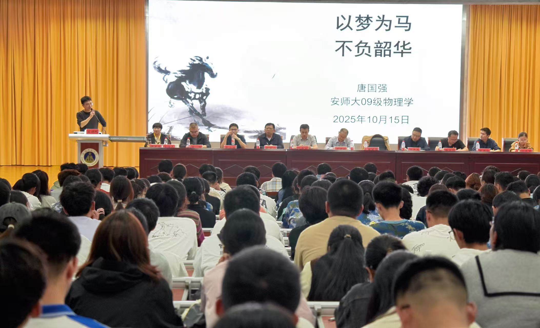 学院还邀请了2009级物理学专业校友、中国科学技术大学教授、博士导师唐国强,为2025级新生带来题为《以梦为马,不负韶华》的新生入学教育之学海导航辅导报告。报告中,唐教授从自己当年在学院的求学生活讲起,娓娓道来他从迷茫到坚定、从汲取知识到探索前沿的成长故事。他结合自身在科研道路上攻坚克难的经历,勉励在场的学弟学妹们要珍惜大学这片沃土,不仅要打下坚实的学业基础,更要勇敢地拥抱好奇心,培养批判性思维。他特别强调,“韶华”之所以珍贵,在于它赋予了每个人追逐梦想的无限可能,希望大家能将个人的兴趣与国家在关键科技领域的战略需求相结合,让奋斗的青春与时代同频共振。