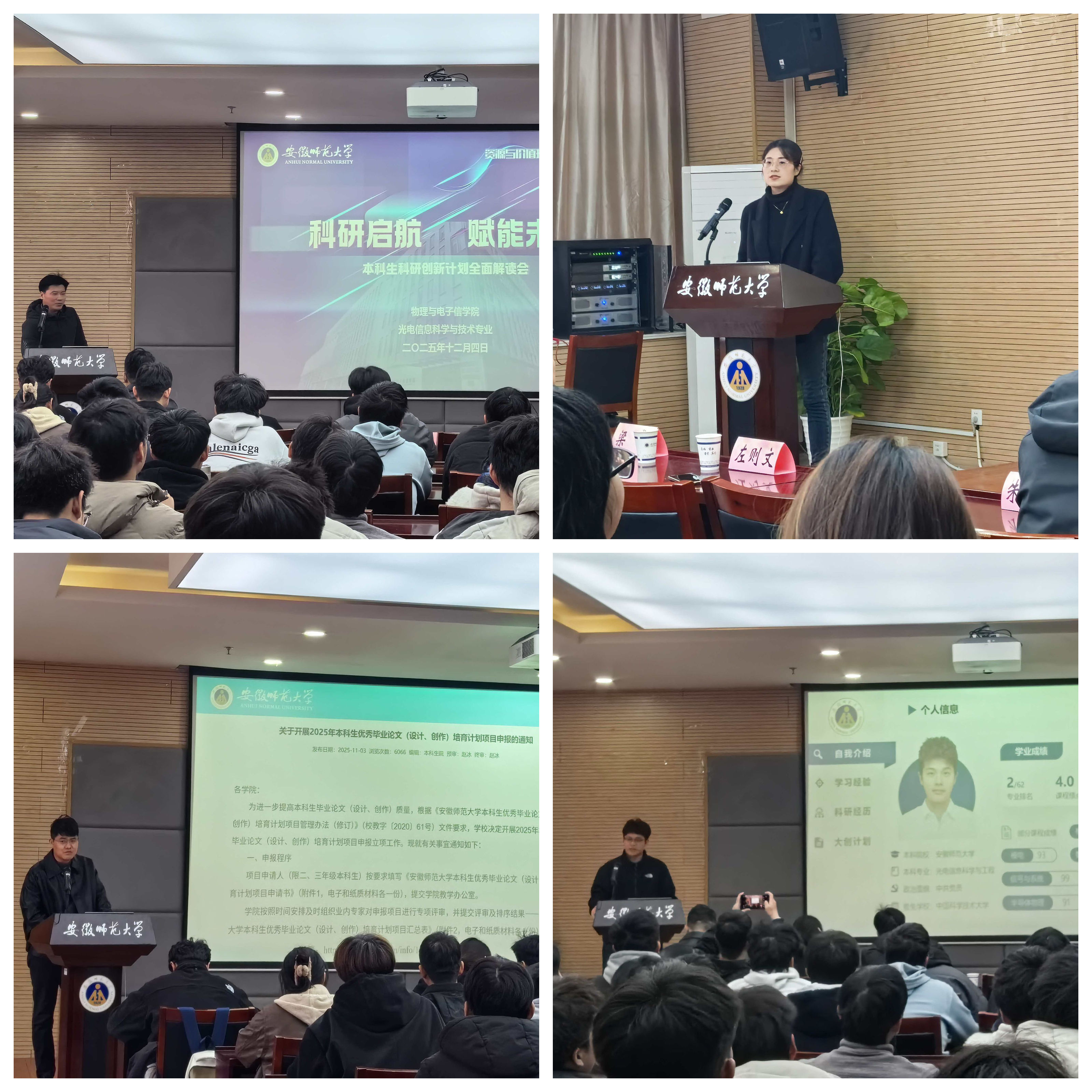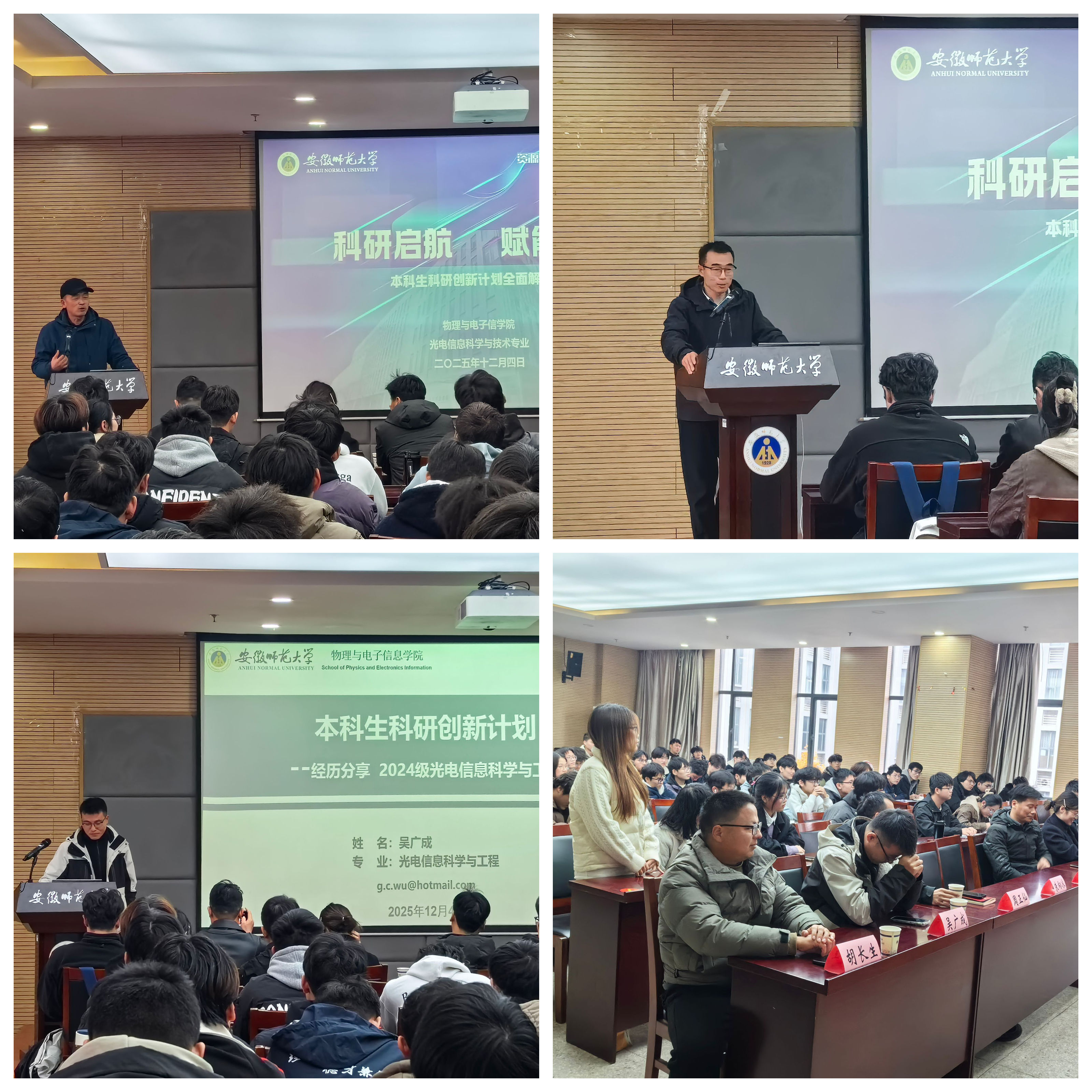 为帮助2024级光电信息科学与工程专业学生厘清学术与职业发展方向,提前规划科研创新路径,12月4日下午,“科研启航,赋能未来”本科生科研创新计划全面解读会在物理楼304会议室举办。学院副院长张爱清,光电专业负责人左则文,光电专业教师朱向冰、周正仙、梁莉、吴广成,班主任吴贵渊、胡长生,2022级光电专业学生吴禹森受邀参加,辅导员张津源主持活动。