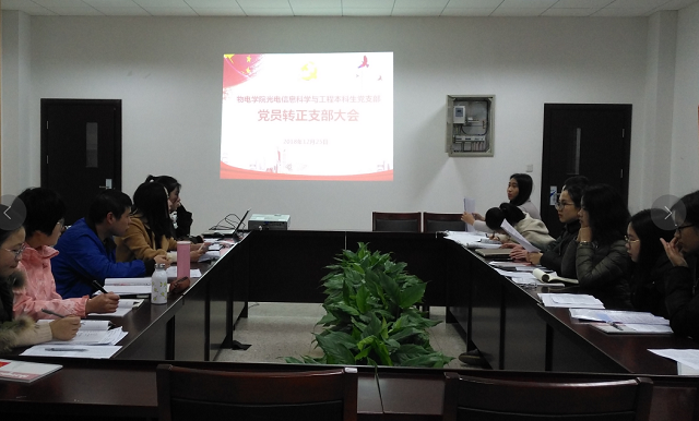 光电信息科学与工程本科生党支部在学院党员活动室召开预备党员转正大会,应到党员17人,实到15人,陈曦、梁婉秋因事请假,会议由党支部书记刘冠琪主持。