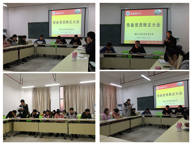 通信工程本科生党支部会议在理科大楼535顺利召开,主要讨论杨靖等七名同志转正为正式党员。会议由支部书记米佳佳主持,入党介绍人14级通信工程辅导员汪光麒应邀出席大会。