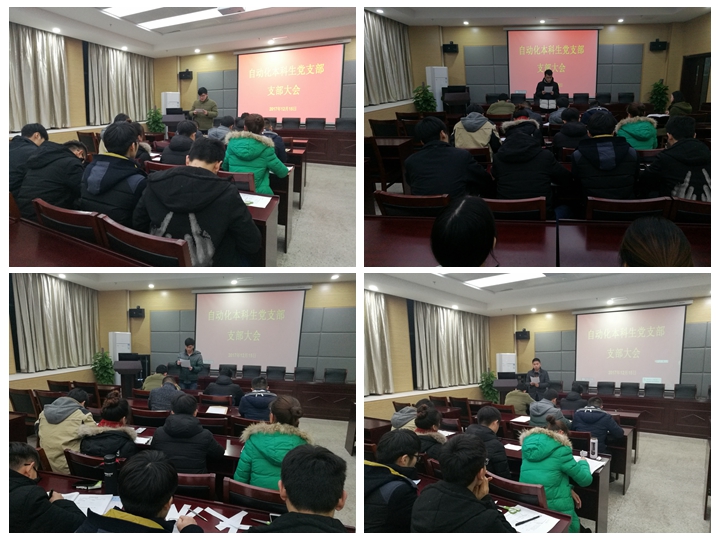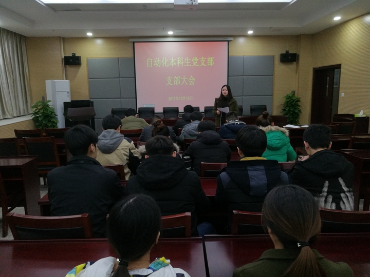 秦瑾琼)2017年12月15日,在物理楼335会议室召开自动化本科生支部大会,讨论陶应健、陈海峰、金毅、陈聪、王晓冉等5名同学转正事项,支部书记秦瑾琼主持会议,自动化本科生党支部全体成员参加会议。