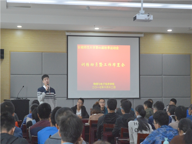 的气势和风采;办公室负责好坐场同学的纪律,彰显良好的学院道德风貌;宣传部要加强宣传报道,让更多的人实时掌握运动会动态;其他部门做好后勤保障工作,服务好运动员。体育部部长张弘毅宣读了运动员名单及训练计划。体育学院的两位教练员分别从田赛和径赛两个方面阐明了训练和比赛过程中的注意事项,希望运动员们能刻苦训练、顽强拼搏,争取在比赛中取得优异成绩。