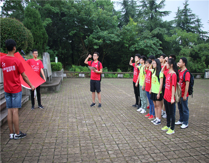 7月1日上午,团队一行13人来到位于蚌埠市龙子湖区的烈士陵园,在庄严肃穆的纪念碑前,全体队员面对鲜红党旗,举起右拳,正容亢色地宣读入党誓词,宣读完毕后。全体队员参观了蚌埠市革命历史陈列馆,瞻仰了蚌埠市在抗日战争期间的革命历程,了解英雄故事。在解说员生动地讲述下,队员们对革命烈士肃然起敬,对来之不易的和平生活无比珍惜,墙上的“革命烈士永垂不朽”八个大字深深触动每个人的心灵。
