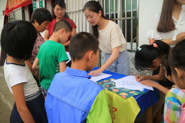 爱心支教。”我们感受到了他们对我们的欢迎。渐渐的很多家长带着孩子们来到了学校,在进行招生活动,经过教长时间的宣传介绍,学生以及家长们对此次活动有了更详细的了解,大家热情支持并积极报名,此次报名活动圆满结束!