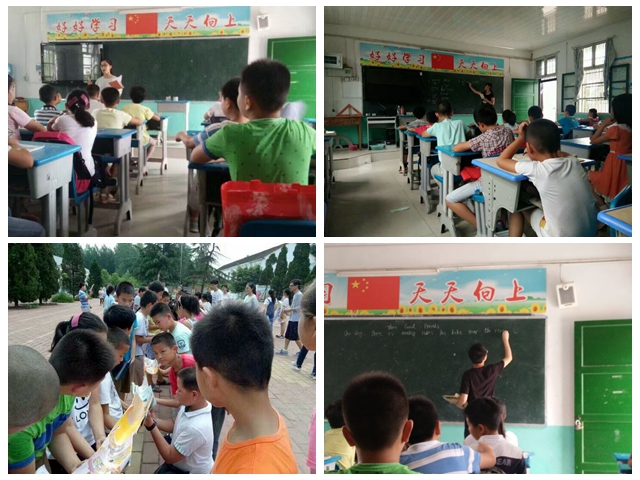 上午的活动中,老师给小朋友们带来了古诗文鉴赏、数学、英语的精彩课程。支教队长用高昂的激情带三四年级的同学朗读《少年强则中国强》这篇文章,在课堂中的学生心中燃起了小火苗。一个个数学题目,让很聪明的他们在低头沉思或抓耳挠腮或两两讨论,课堂气氛很是活跃。在这个贫困的小学,同学们对英语的了解很少,连简单的口语都知之甚少,英语课大多数被改成了书法课。故英语课是以专题的形式教给大家,今天教的是一组十个形容人外貌的单词和句型,然后让同学之间互相询问班里其他同学的外貌,做到活学活用。