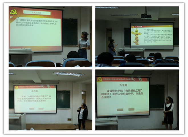 此次答辩分为两个环节,4分钟的个人PPT汇报和2分钟的现场答辩。个人汇报环节中,答辩者依次介绍了个人的入党动机,政治理论、专业课程学习,工作、生活、服务等各方面表现,自身还存在的不足以及改正方法。答辩者中不乏学习上的佼佼者,志愿服务的先行者,学生工作的优秀者,充分展示了学生党员的素质修养水平。