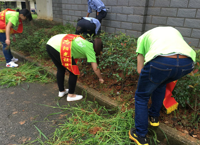 7月8日上午,队员们来到芜湖县阳光新城小区进行志愿服务,居委会负责人热情的接待了大家。开始队员们希望能由社区出面,组织队员们前往芜湖县抗洪防汛的居民安置点进行志愿服务,社区负责人考虑实际情况和队员们的安全问题,将队员们留在小区进行志愿服务,为小区进行环卫。队员们在社区进行小广告、杂草的清理,打扫社区环境,协助社区保安开展相关的卫生维护活动等。