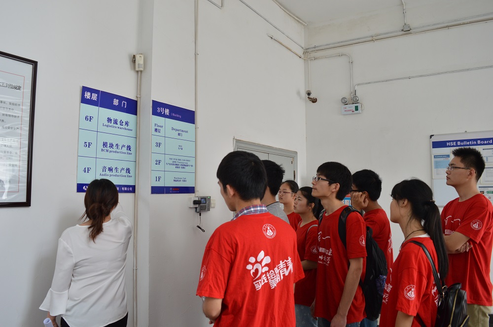 活动开始,实践队员到达埃泰克汽车电子有限公司,在埃泰克领导阶层袁经理的带领下,队员们来到实习部门生产部,队员们在生产部门主管的指导下做好进入生产车间的准备。在车间,队员们参观了生产流水线,深切体会到了工人的辛苦也感受到了科技的发达。